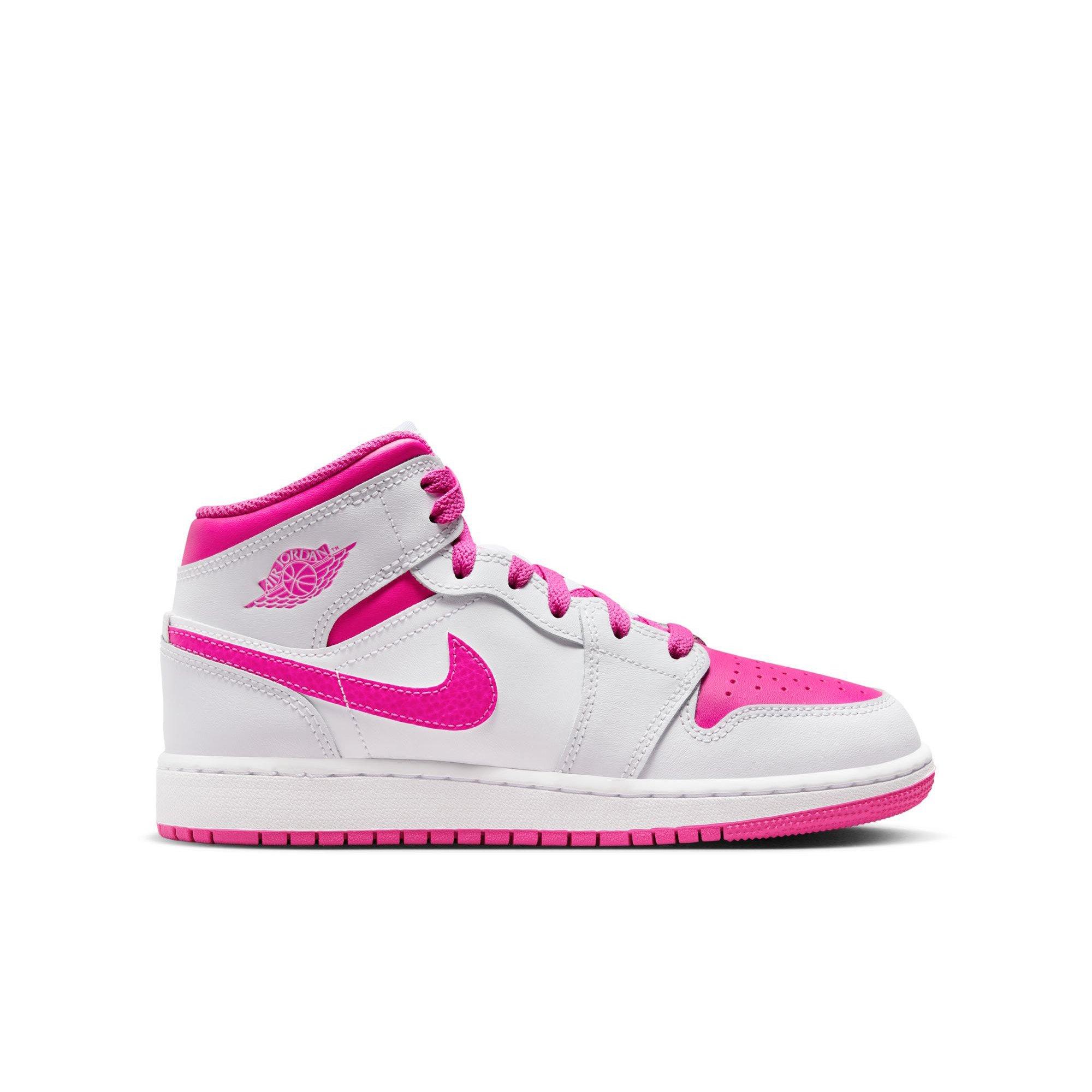 Pick pink for the win! This Jordan 1 Mid "Iris Whisper/Fire Pink/White" Grade School Girls' Shoe pops to life with a bright mix of rosy hues. All your classic Jordan comforts are there too: Nike Air in the sole for a cushioned step, and that rubber cupsole for everyday comfort.Features