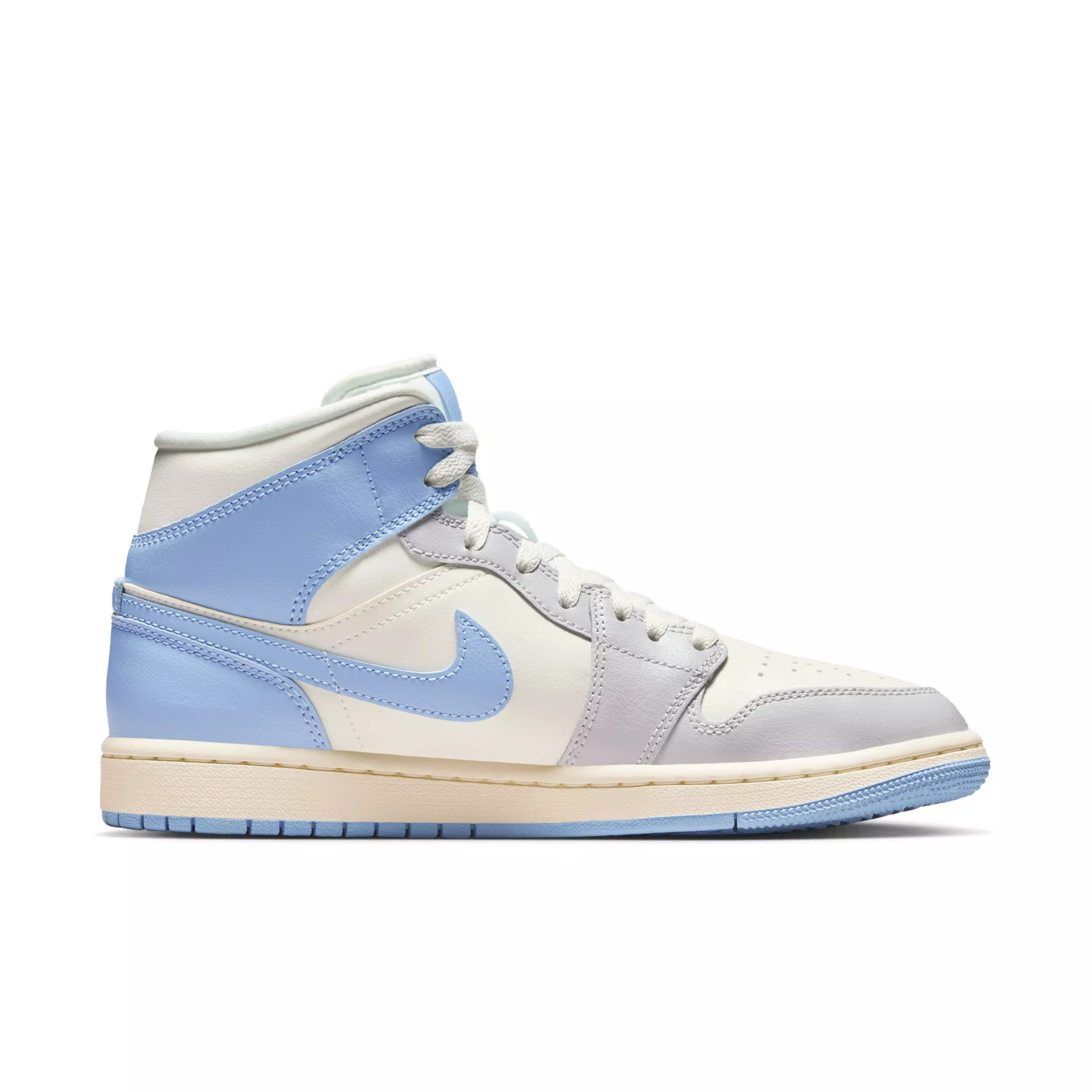 The Jordan 1 Mid "Psychic Blue/Sail/Coconut Milk/Neutral Grey" Women's Shoe brings full-court style and premium comfort to an iconic look. Its Air-Sole unit cushions play on the hardwood, while the padded collar gives you a supportive feel.Features