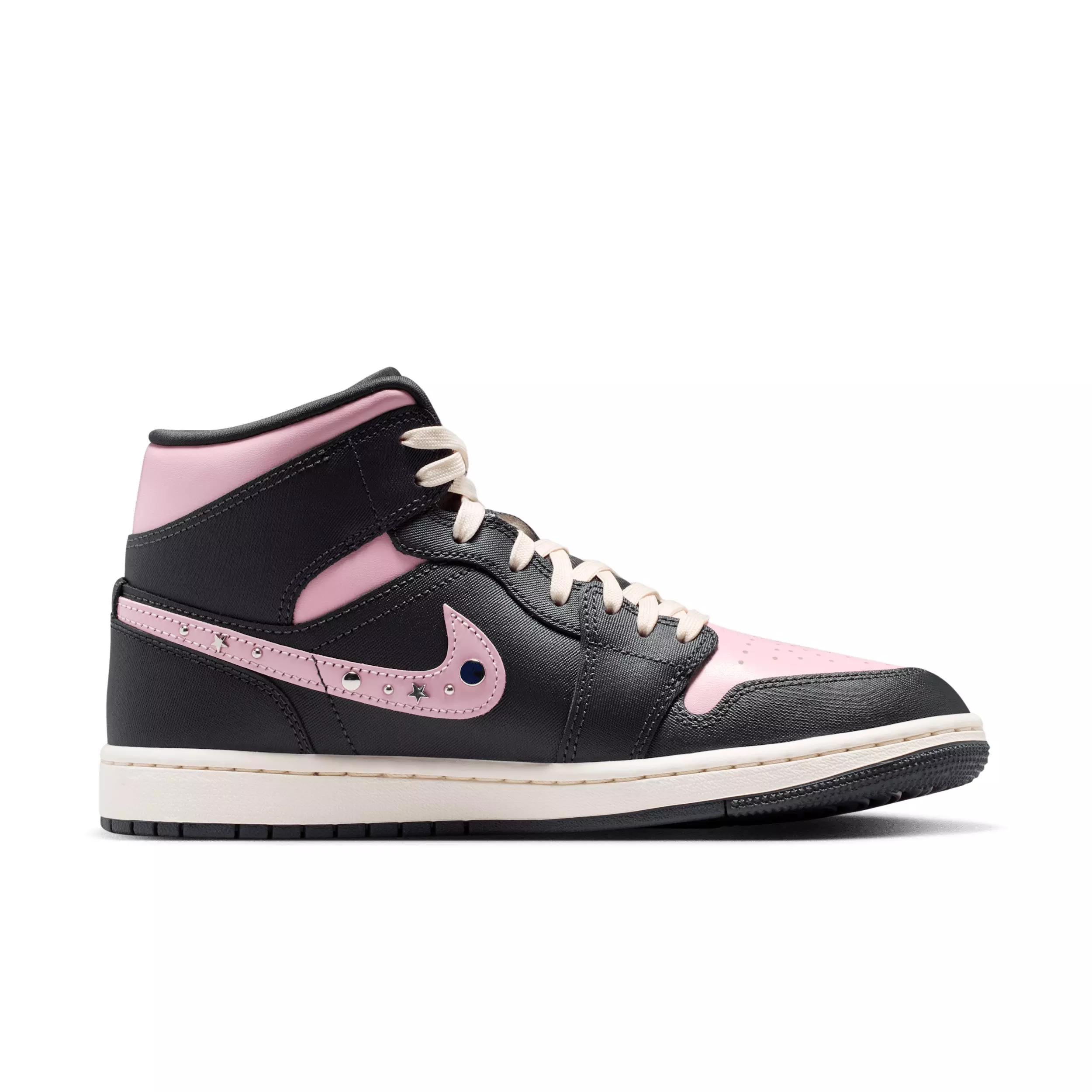 Inspired by the original AJ1, this Jordan 1 Mid SE "Anthracite/Iced Carmine/Coconut Milk/Metallic Silver" Women's Shoe maintains the iconic look you love while studded details and crisp leather give it a distinct identity.Features