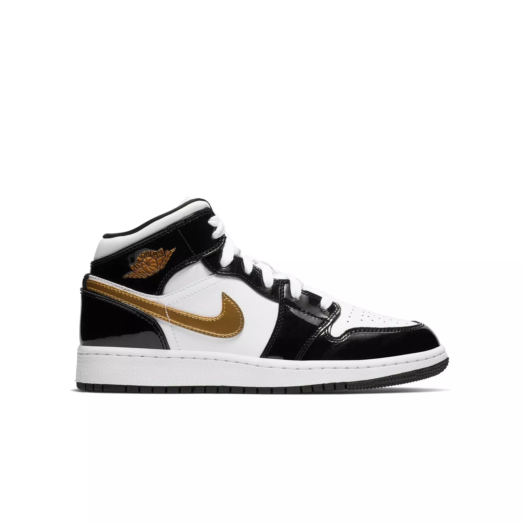 THE BOMB.The Jordan 1 Mid SE "Black Gold" Grade School Kids' Shoe has the classic design of the original AJ 1 with color and material upgrades. The Black/Gold colors continue the story of the Jordan Gratitude and DMP colorways. Leather is durable and easy to clean, while the Air-Sole cushioning provides all-day comfort.