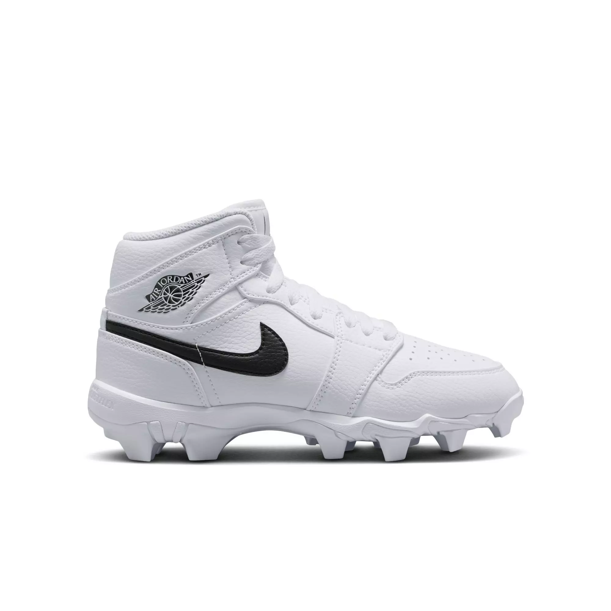 The Jordan 1 Mid "White/Black" Grade School Boys' Multisport Cleat offers a competitive edge with wide stud placement that enables fast cuts. External pods deliver optimal traction during quick pivots on any playing surface.