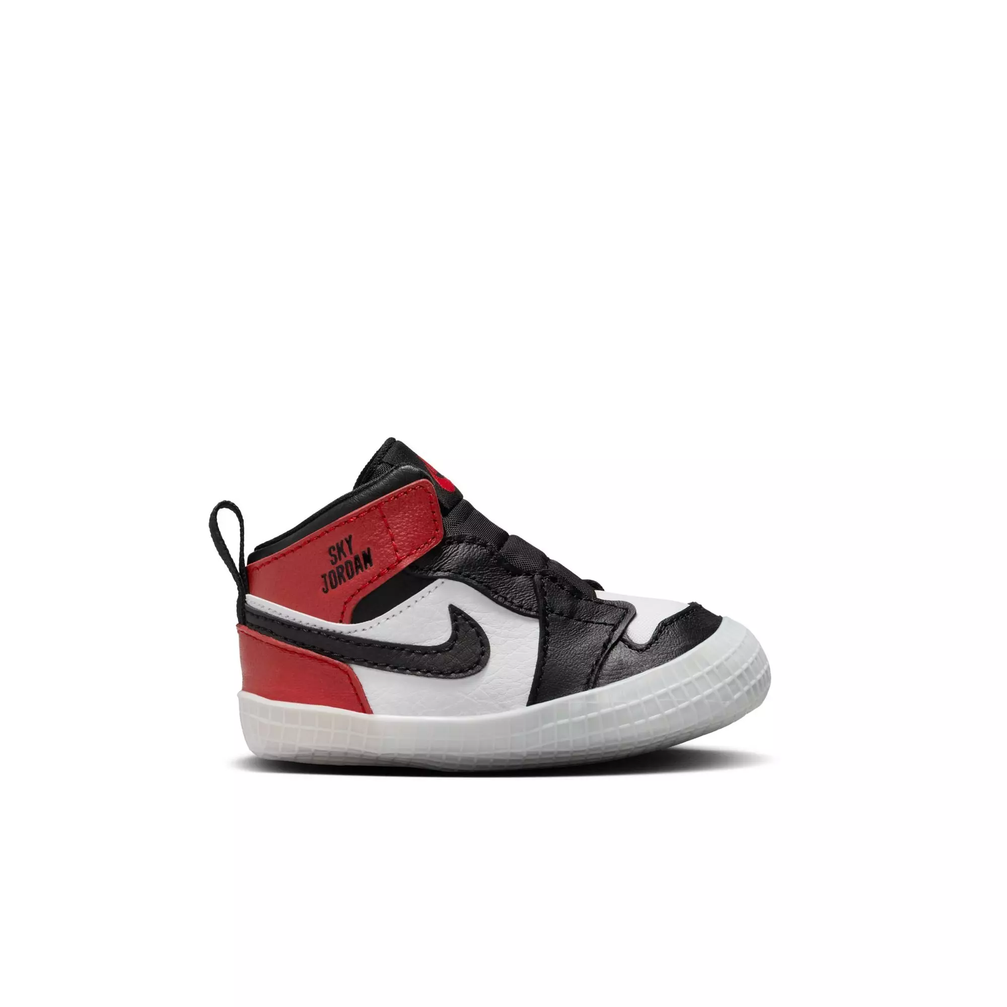 The Jordan 1 Retro High OG "Black Toe" Crib Bootie features a soft, flexible outsole and minimal underfoot padding. This lightweight design supports little feet as they develop balance and coordination. Its iconic color blocking adds timeless style.