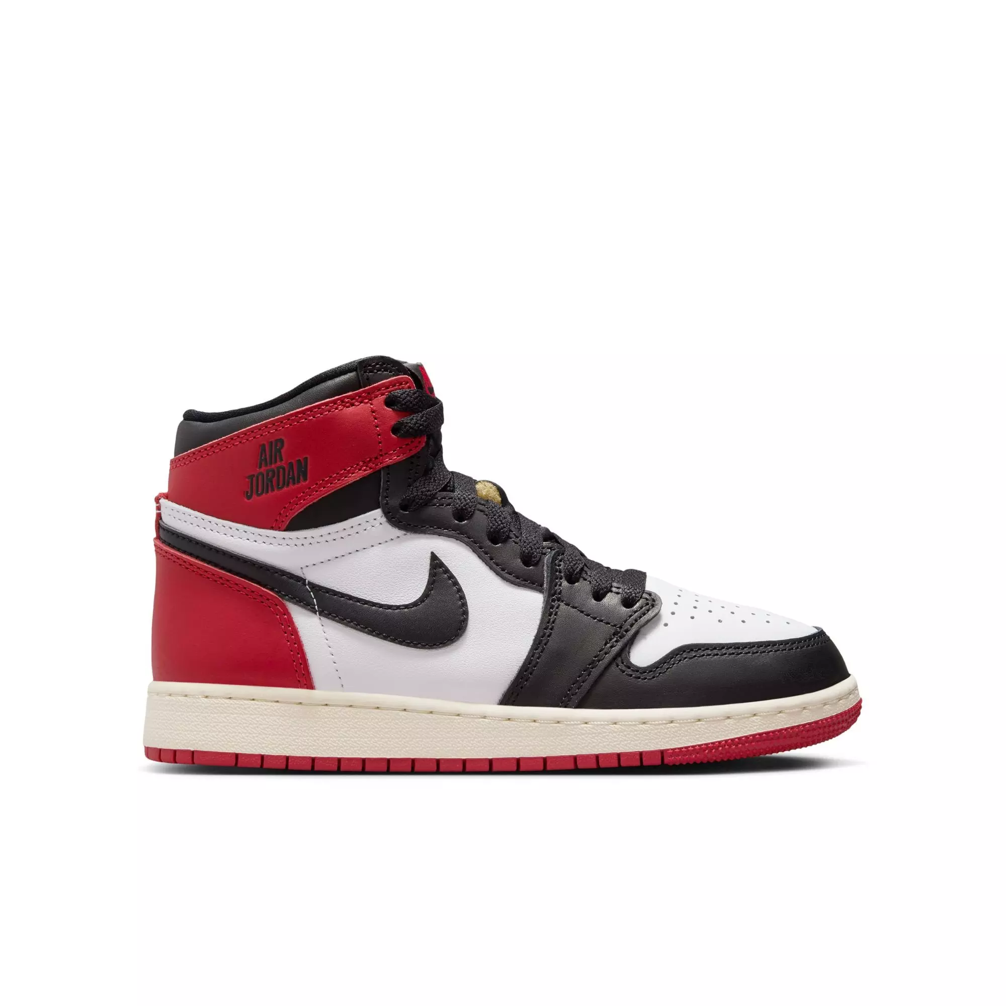 The Jordan 1 Retro High OG "Black Toe" Grade School Kids' Shoe blends a familiar silhouette with fresh elements. Iconic design returns with premium leather construction and authentic color blocking.