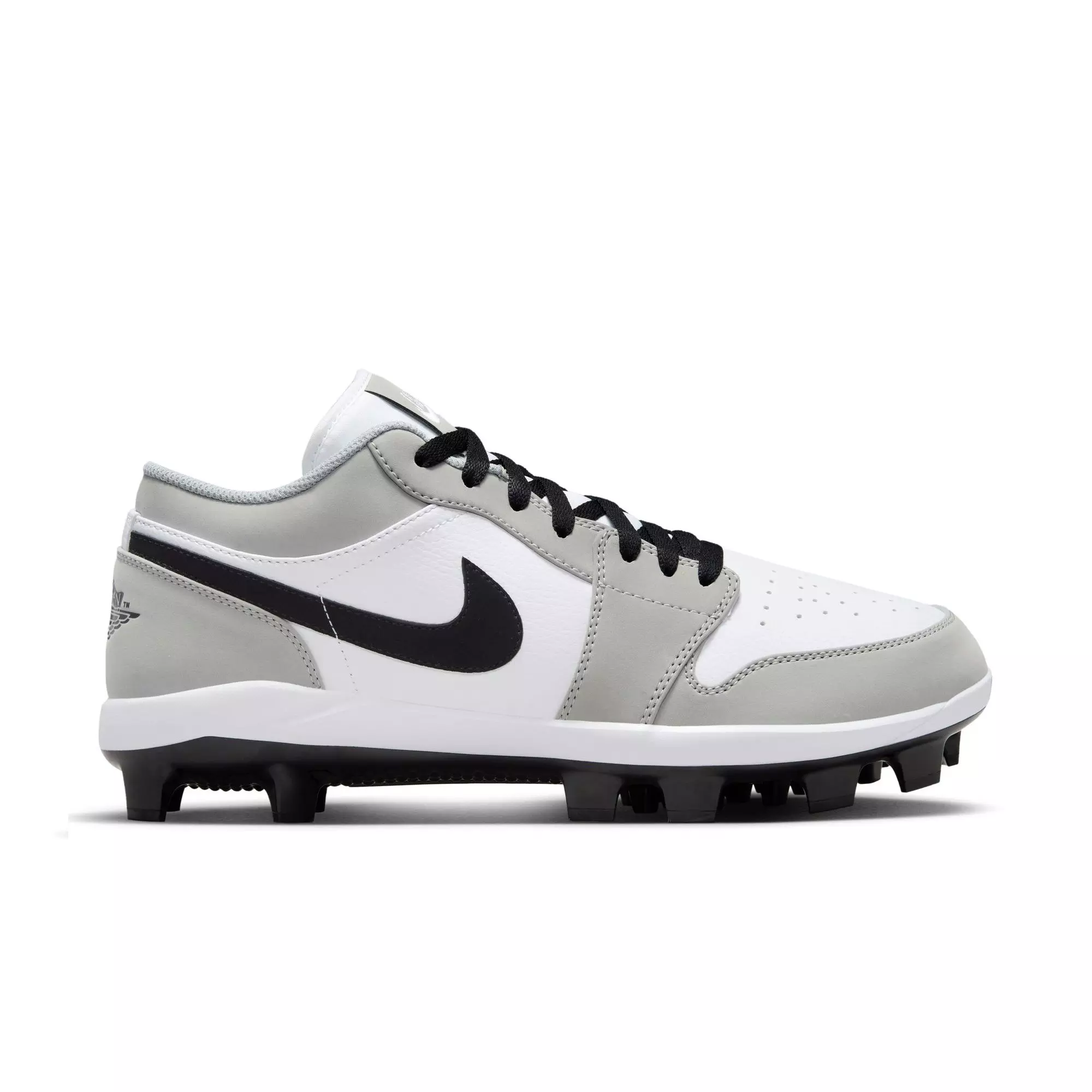 The Jordan 1 Retro MCS Low 'Lt Smoke Grey/Black/White' Men's Baseball Cleat brings iconic Air Jordan 1 design into the ballpark. Its molded outsole delivers traction that digs into turf.