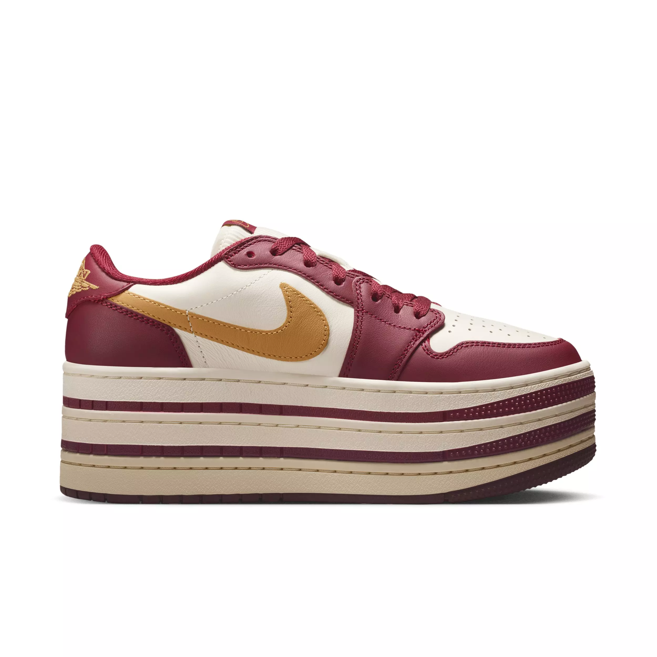 Stand tall with elevated style. Inspired by the original that debuted in 1985, the Jordan 1 Triple Stack "Team Red/Pale Ivory/Sanded Gold" Women's Shoe offers a clean, classic look that's familiar yet always fresh. This remix boldly reworks the icon's original magic with a triple-stacked sole. With an unmistakable design grounded in hoops heritage, these kicks ensure your 'fit is always on point.Features