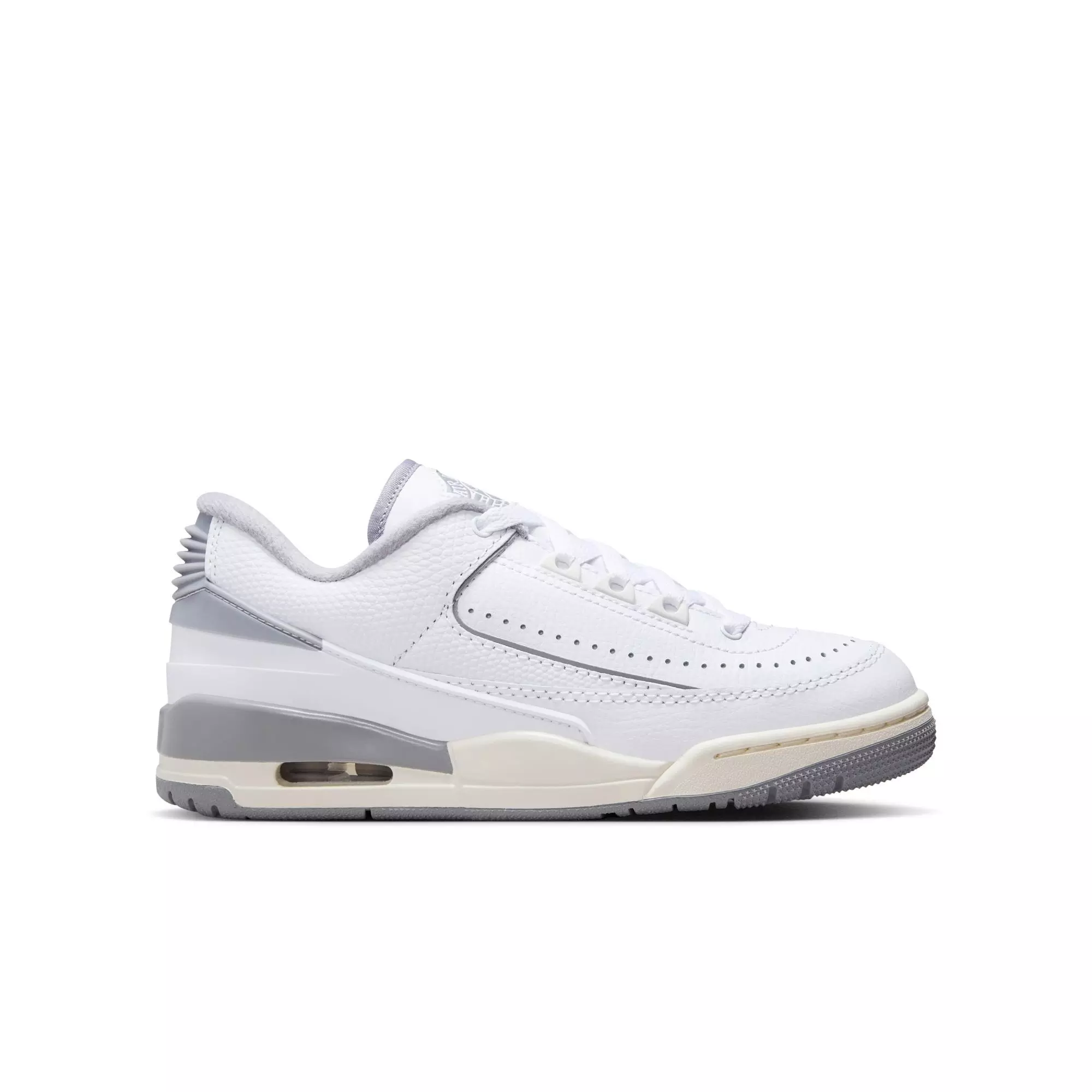 The Jordan 2/3 "White/Cement Grey/Sail" Grade School Boys' Shoe merges the AJ2 sole with signature AJ3 design cues. It uses premium textured leather and highlights visible Air cushioning to enhance comfort and lasting durability.