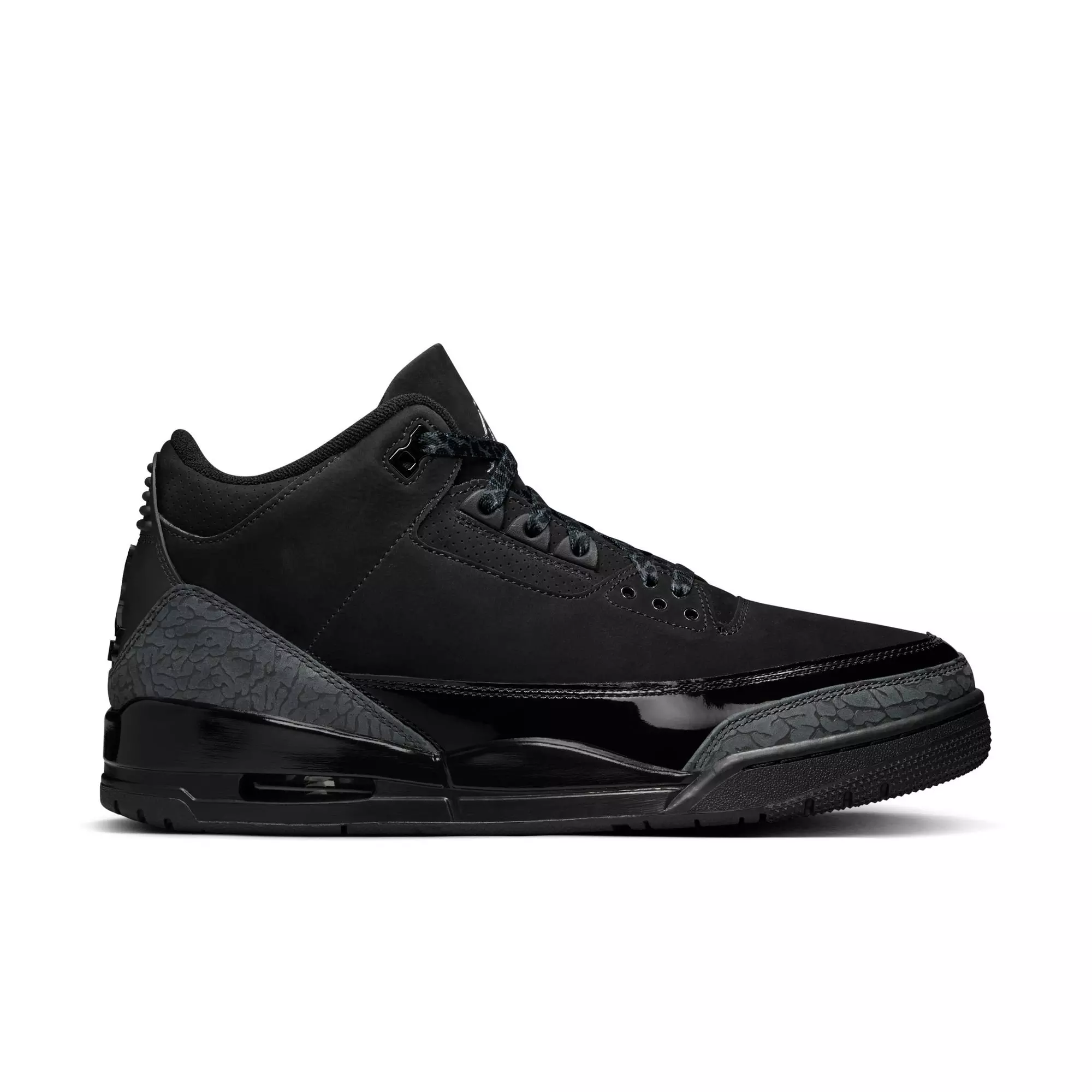 The Jordan 3 Retro "Black Cat" Men's Shoe revisits its classic design with premium leather and a rich elephant print texture. It highlights sleek lines and timeless style to elevate any look.