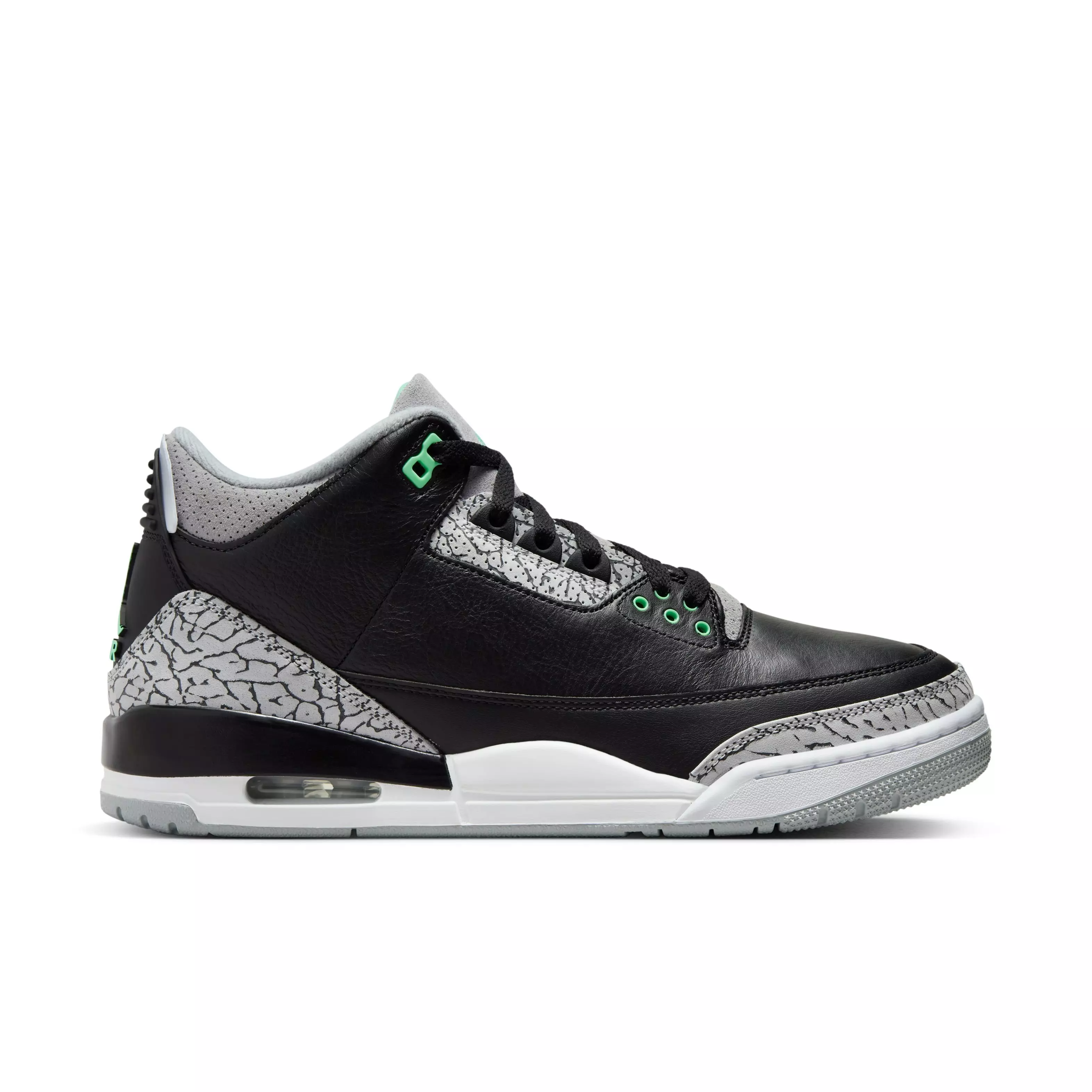 Clean and supreme, the Jordan 3 Retro "Green Glow" Men's Shoe returns with all of its classic style and grace. Quality leather in the upper—with that luxurious elephant print texture—combines with visible Nike Air in the sole to make a comfortable, everyday icon.