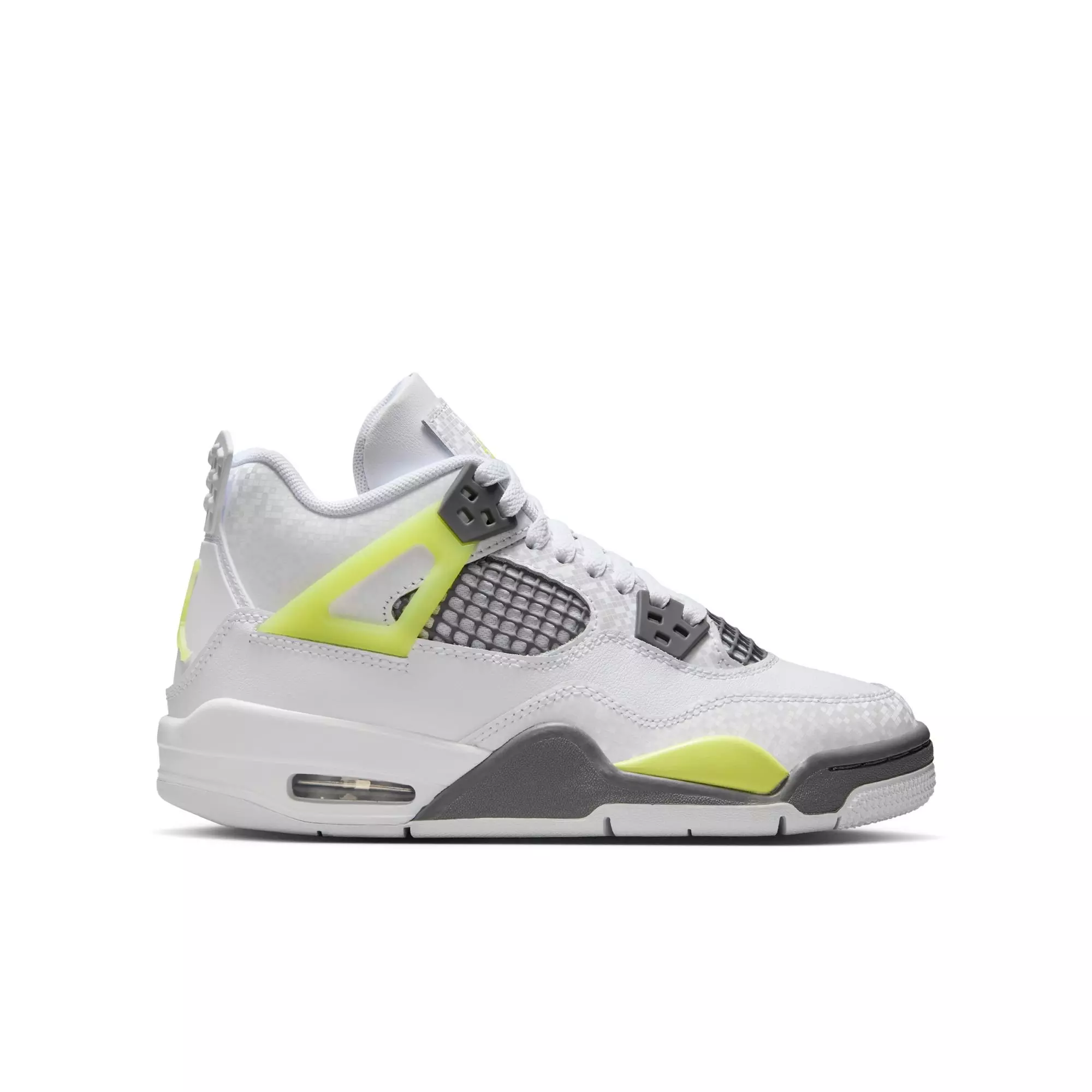 The Jordan 4 Retro "Light Lemon Twist" Grade School Kids' Shoe adds vibrant color to each step with bright accents on the leather and mesh upper, showcasing youthful style. It preserves iconic mesh windows and striking eyestays.