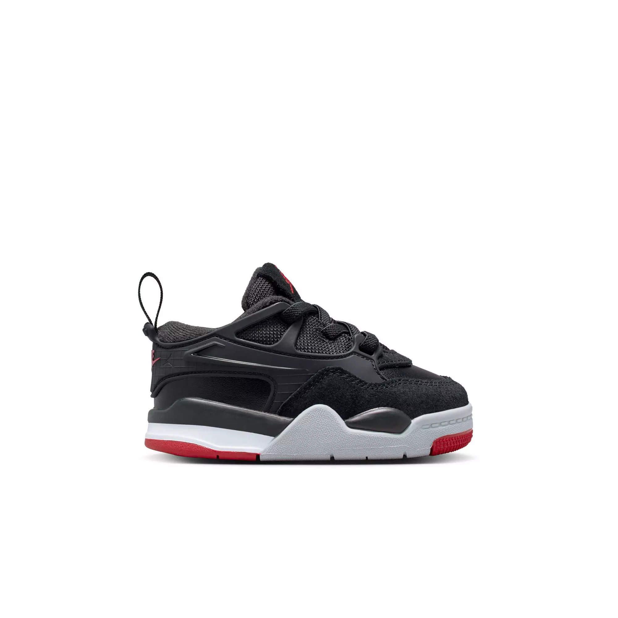Elastic laces and handy pull tabs make these sneakers easy to slip on and off, even for active toddlers. The bold mix of black, varsity red, wolf grey, and white creates a striking look that pairs heritage Jordan style with play-ready performance.