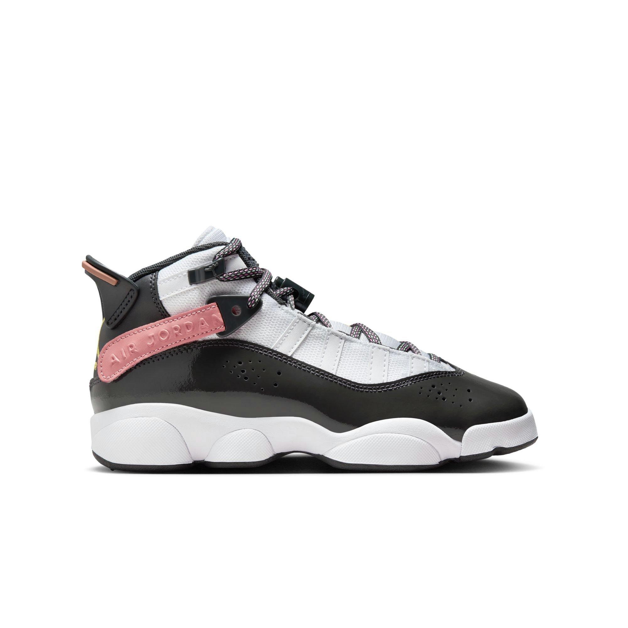 Pay homage to MJ's career in the Jordan 6 Rings "White/Anthracite/Red Stardust" Grade School Girls' Shoe. Pulling in elements from a range of iconic kicks—like the mudguard from the AJ11 and the outsole and midsole sculpting of the AJ13—this take on the classic hoops shoe will have you feeling like a winner.