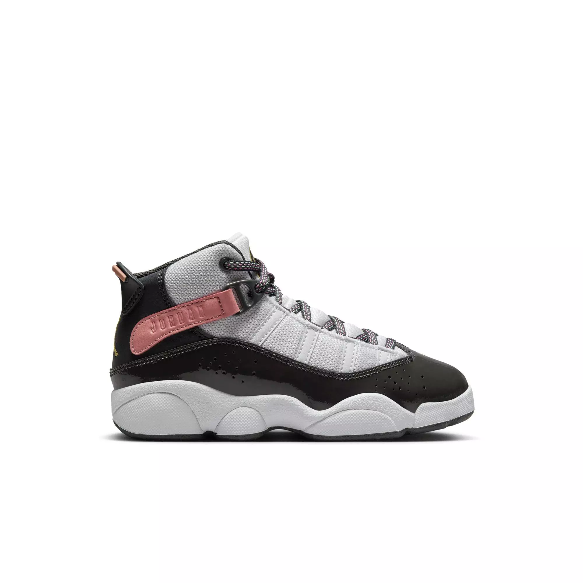 Jordan 6 Rings "White/Anthracite/Red Stardust" Preschool Girls' Shoe1, 2, 3...6! Counting MJ's rings is fun. With design elements from each shoe worn during his six championship runs, the Jordan 6 Rings "White/Anthracite/Red Stardust" Preschool Girls' Shoe brings a premium look and feel to little feet. A secure strap and heel tab help make on-and-off quick and easy.