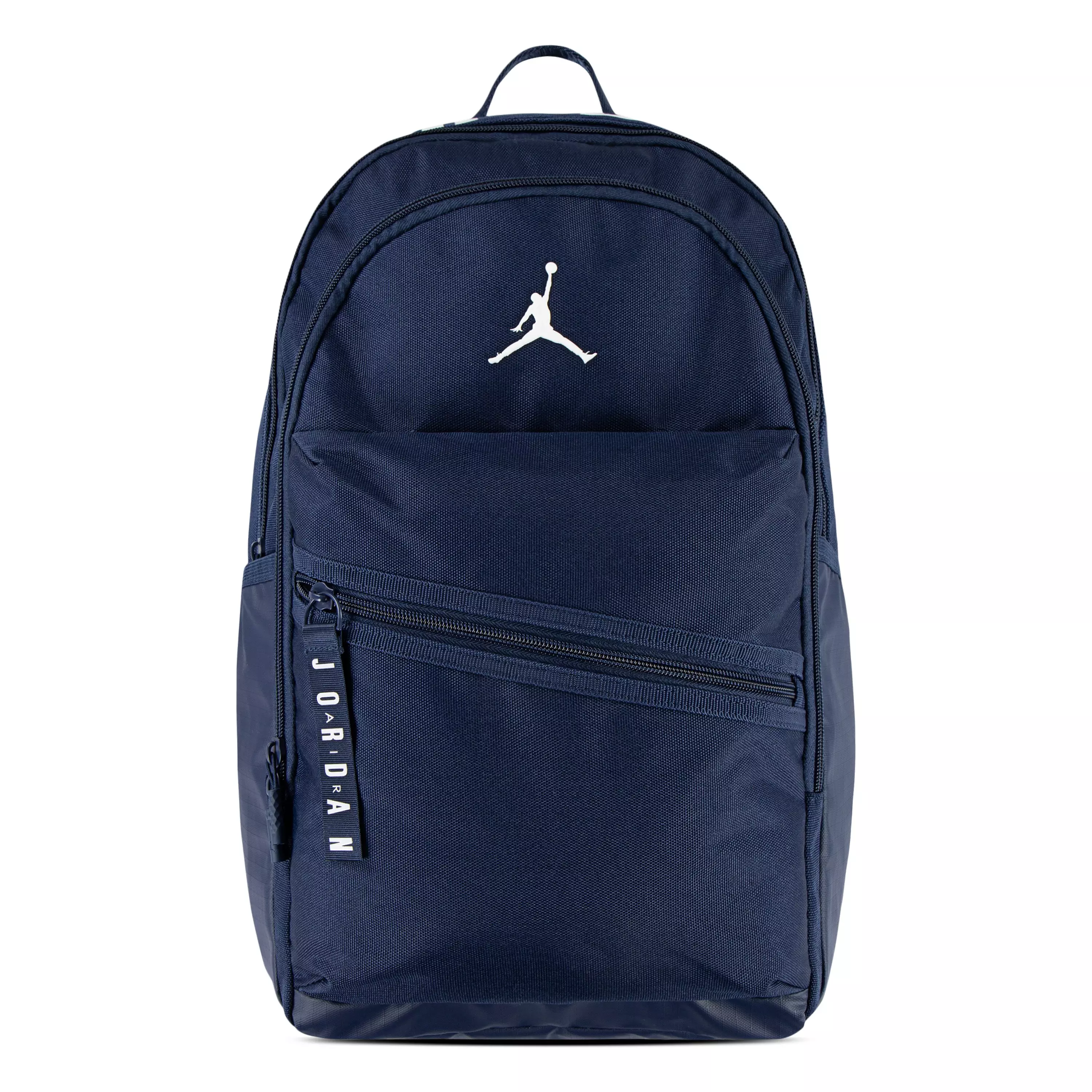 Carry your stuff in sport DNA style with this durable, spacious Jordan Air Patrol Backpack-Navy. The main zippered compartment can easily hold books, a change of clothes or anything else you need for your day. The front compartment on the houses an organizational pocket you can use to keep smaller items in their place, and the compartment on the back has a padded tech sleeve to help protect your tablet or laptop. use the side bottle pockets to hold your favorite beverages and toss items you need quick and easy access to in the front pocket.Features