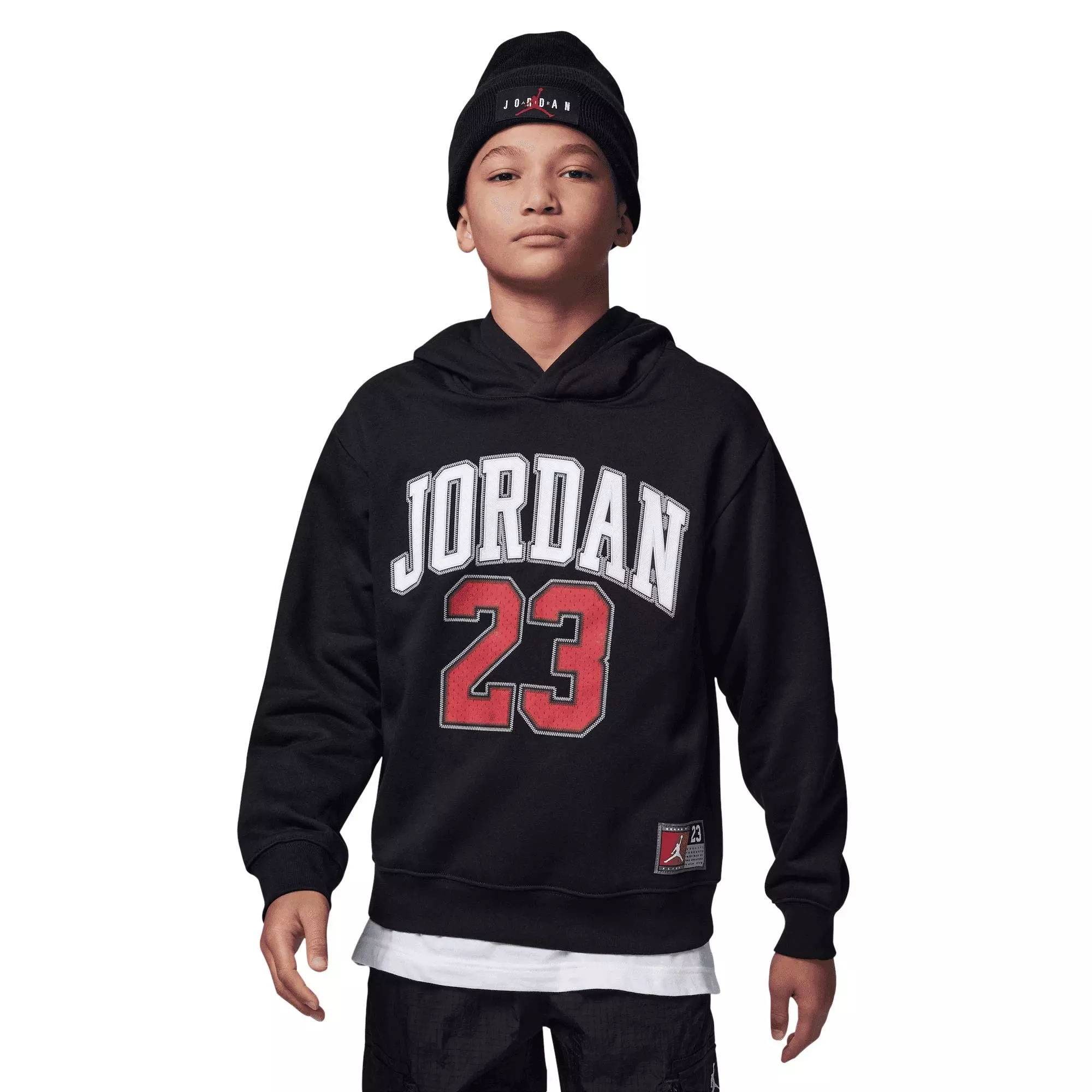 The Jordan Big Boys' 23 Hoodie - Black keeps kids comfy from school to weekend play. Made with soft fleece in a roomy cut, it layers easily over tees or under jackets. A cozy hood and dropped shoulders create a relaxed feel they'll reach for daily.