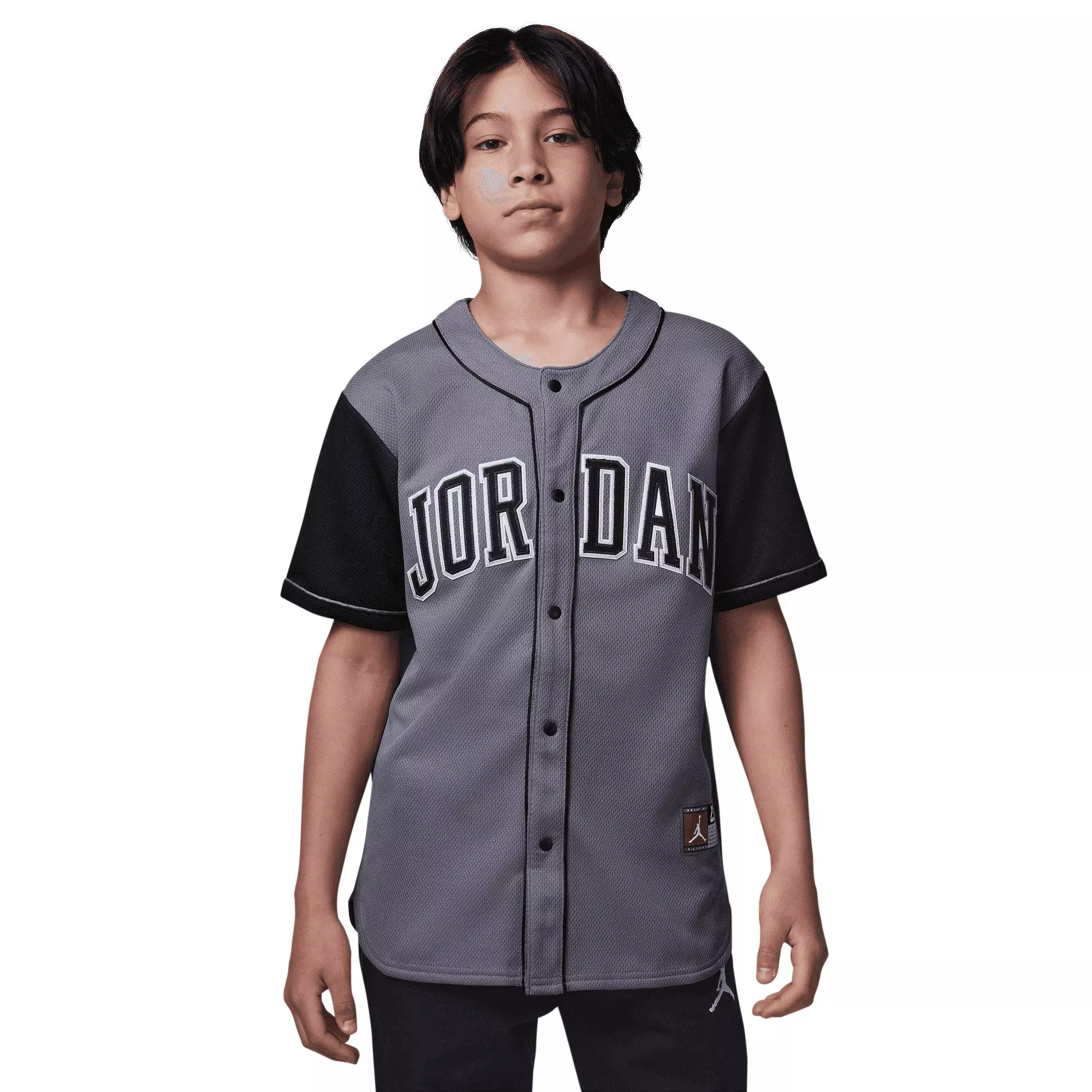 Jordan Big Boys' Baseball Jersey - GreyGet ready for the big-league call-up with our Jordan Big Boys' Baseball Jersey - Grey. Soft, sweat-wicking fabric helps you stay cool on and off the field. Its relaxed fit easily layers over your favorite tee, while the crest and traditional lines celebrate the heritage of baseball culture.