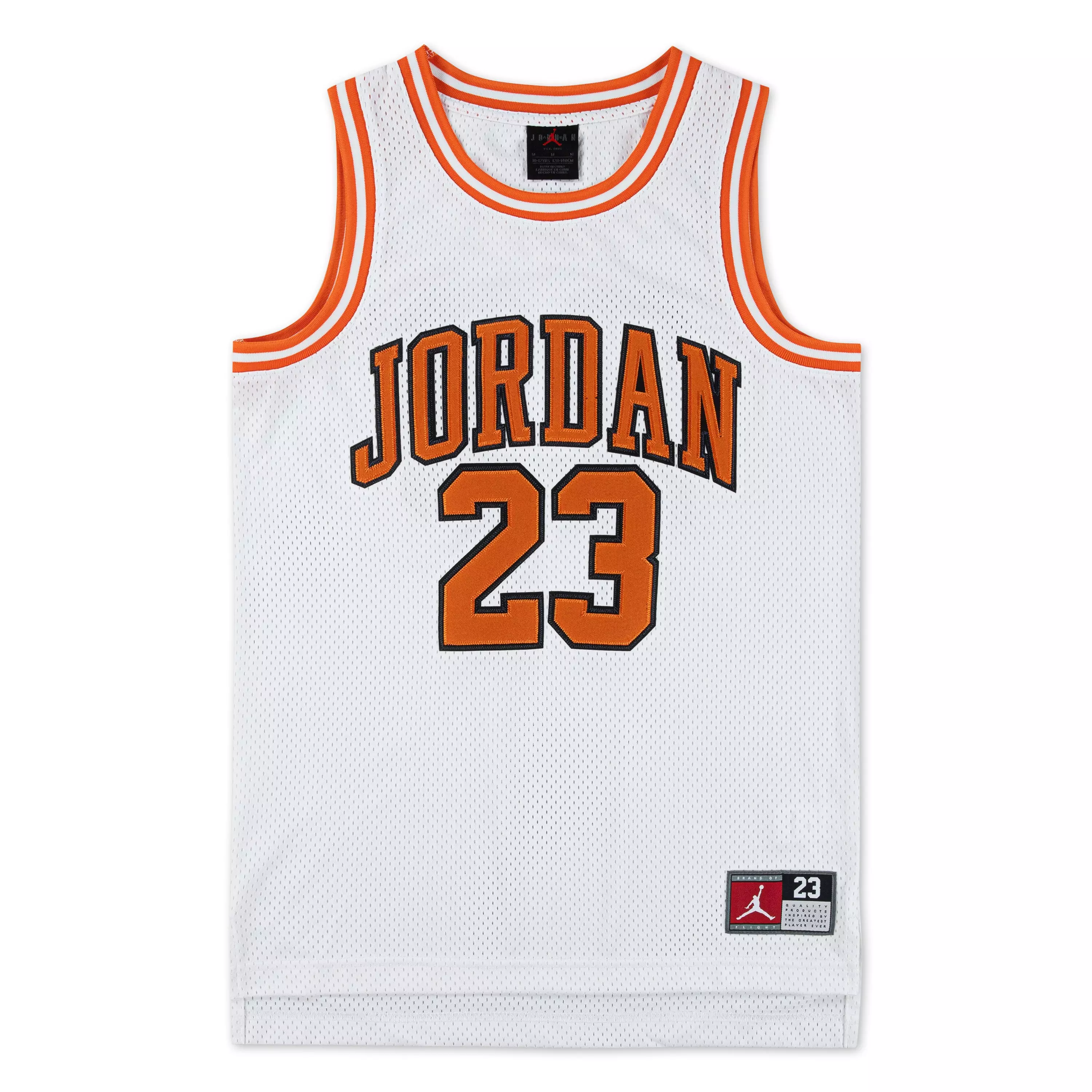 The Jordan Big Boys' Basketball Jersey - White/Orange channels the game’s heritage with bold, team-inspired colors. Modeled after what the pros wear, it delivers a classic, on-court look with a comfortable fit that stands out for practice, pickup runs, and everyday activity.