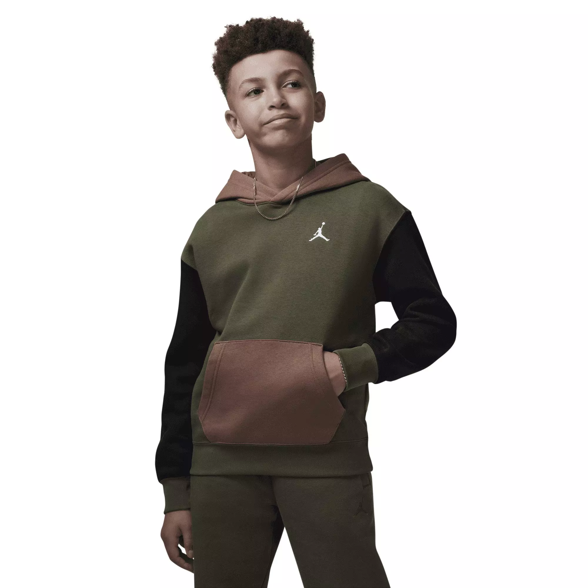 The Jordan Big Boys' Brooklyn Fleece Hoodie - Green/Multi features high-quality fleece with a smooth exterior and plush interior that adds softness and warmth to every wear. Its pullover style includes an adjustable hood and kangaroo pocket.