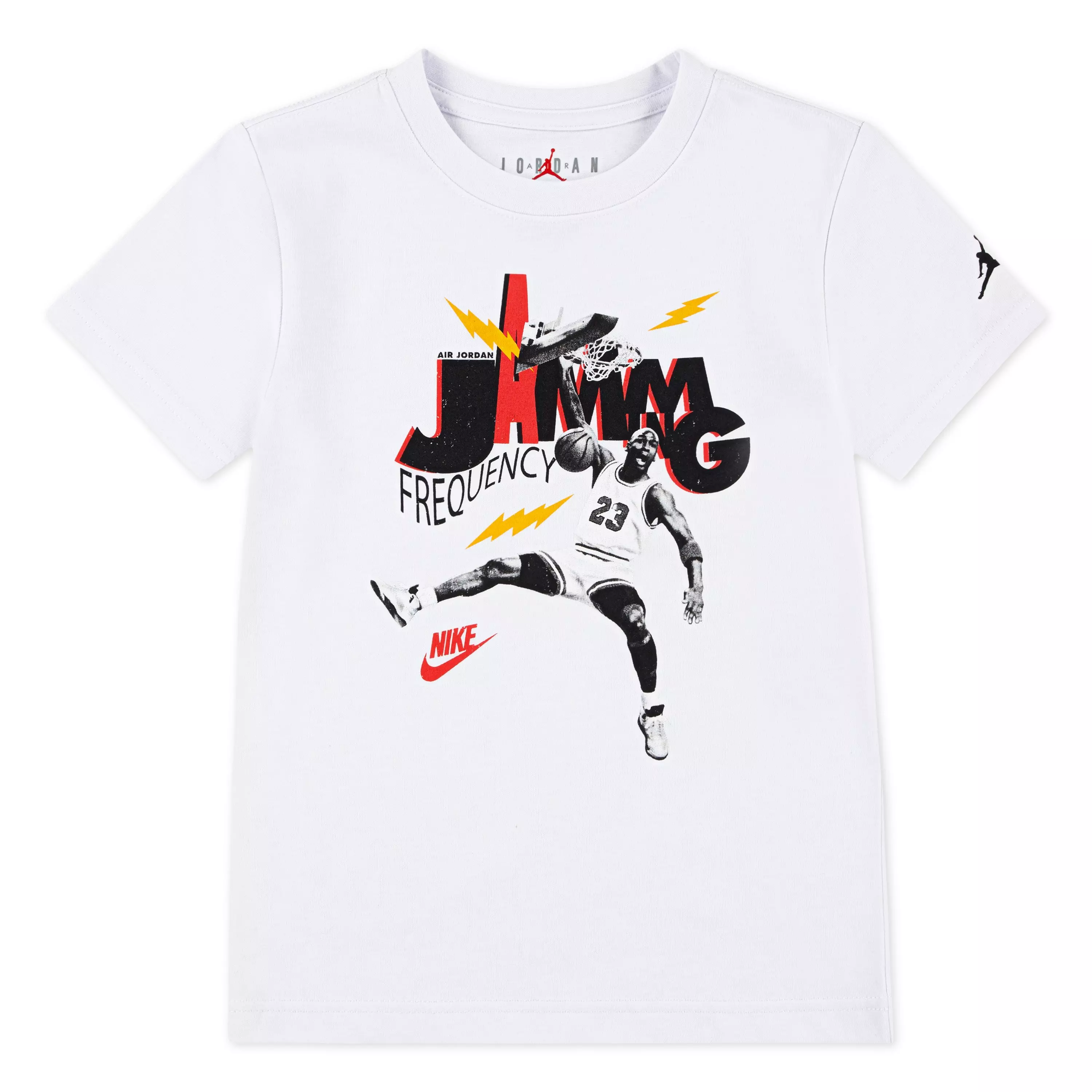 Jordan Big Boys' MJ Jamming Tee feels comfortable and enhances overall breathability with its lightweight fabric. It offers a relaxed fit that lets young athletes move freely throughout the day and feels soft against the skin.