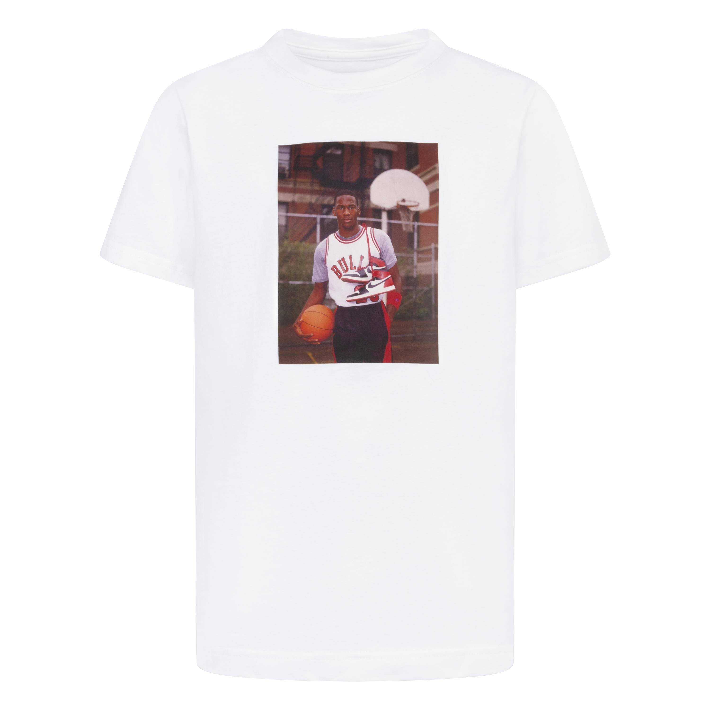 The Jordan Big Boys' Photo Tee - White displays a large Jumpman graphic across the front, delivering a bold look. Its clean white color pairs easily with any outfit, creating a versatile addition to a youngster's wardrobe.