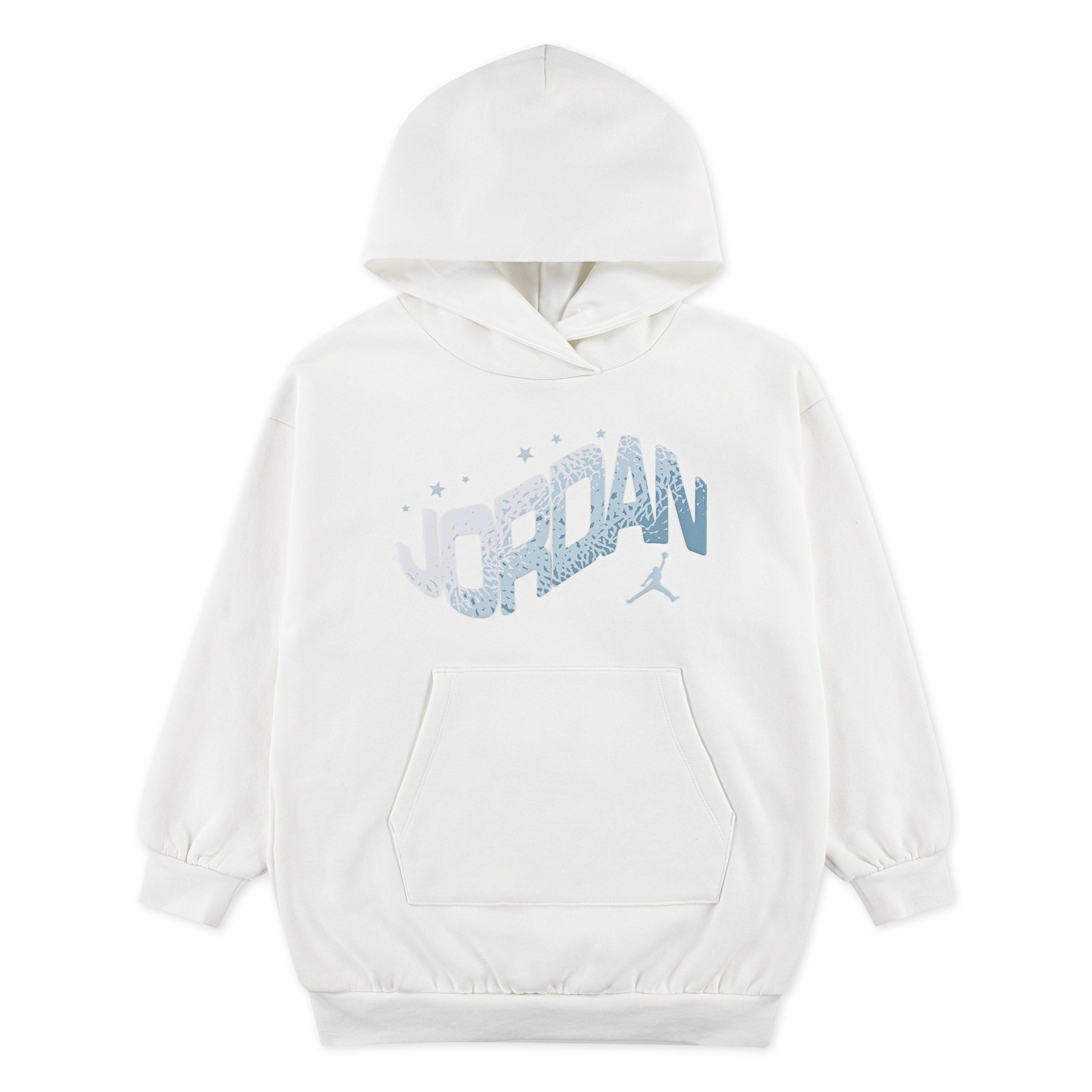 Flaunt your stuff in this Jordan Big Girls' Oversized Hoodie - Sail, made of soft cotton/poly fleece containing lurex fibers that create an allover subtle shimmer. The roomy cut and dropped shoulders create a relaxed fit with a cozy feel and the metallic wordmark logo perfectly complements their Jordans.Features