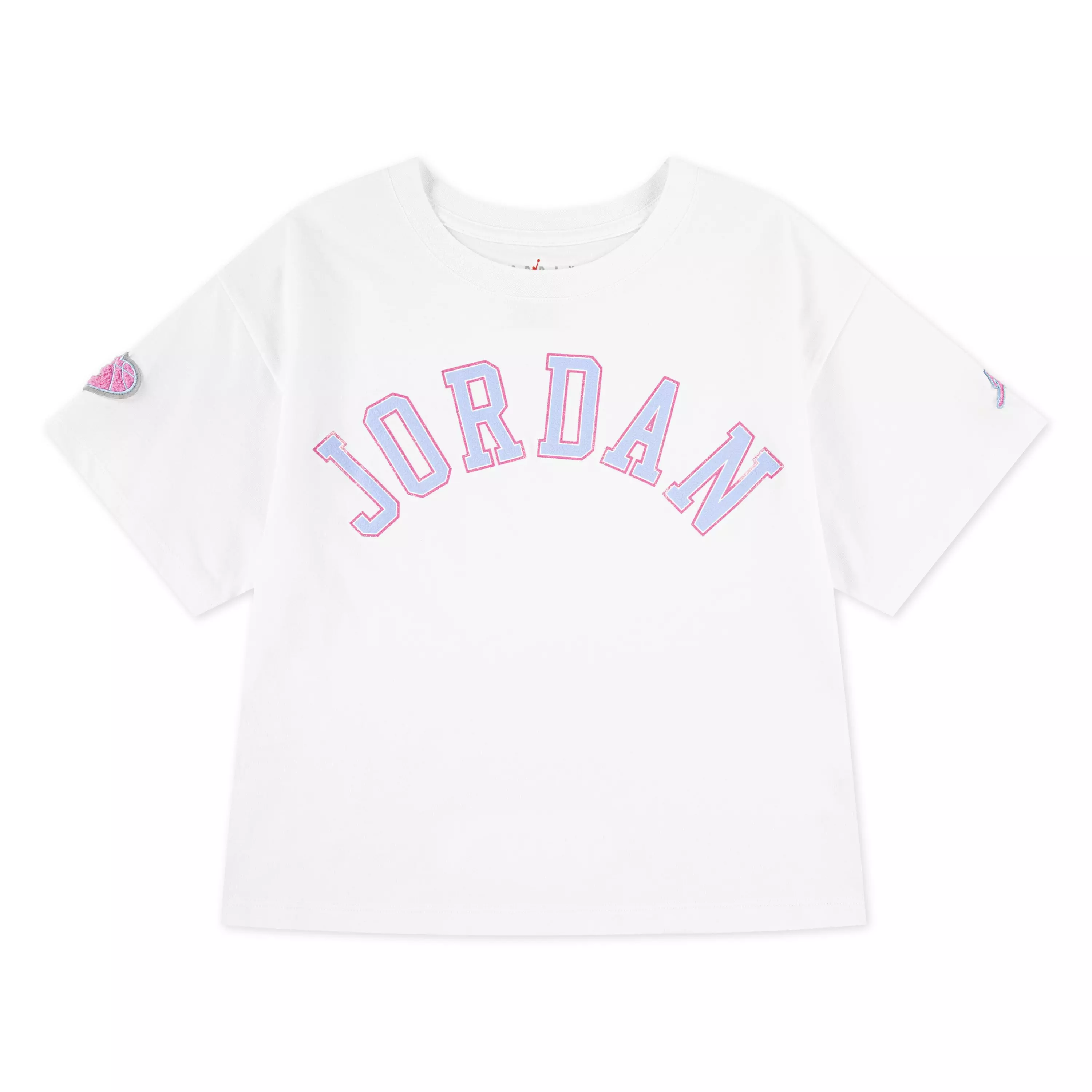 The Jordan Big Girls' Patch Tee is a simple, structured heavyweight cotton tee that holds its shape through wash cycles. It delivers a crisp silhouette that stays sharp wear after wear.