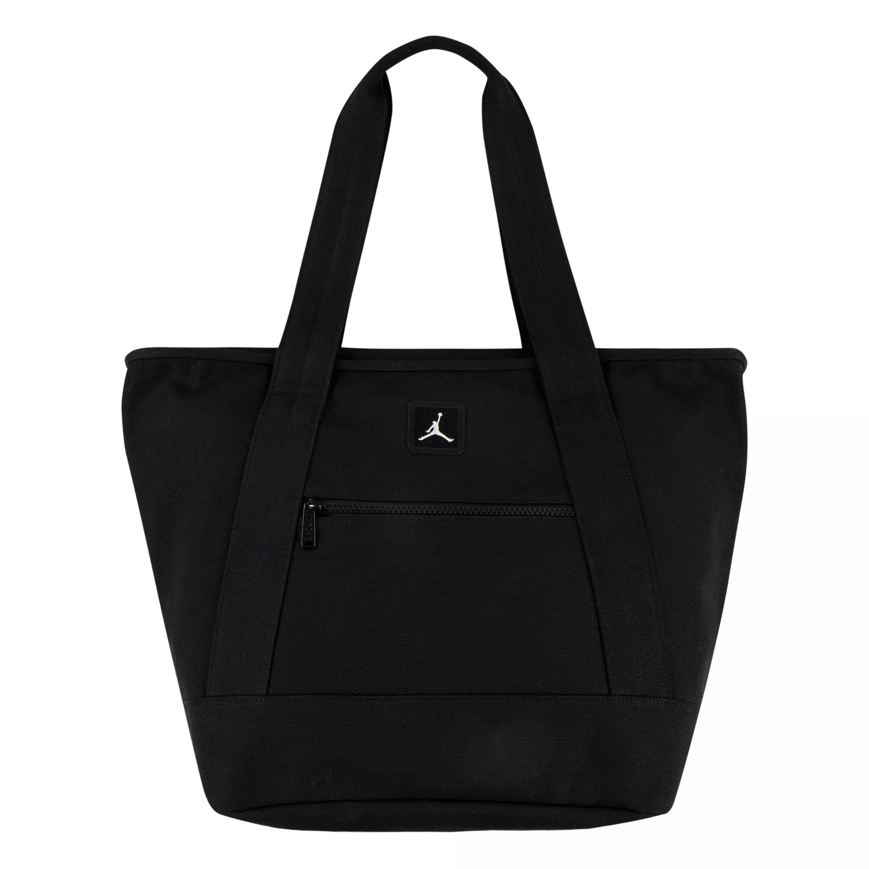 The adventures of the Amazing Air Jordan are displayed on this Jordan Core Jumpman Tote-Black. It's made of durable organic cotton canvas with a zippered main compartment spacious enough for shopping trips, books for class or a change of clothes for the gym. The handles are long enough for comfortable over-the-shoulder wear and the interior drop pocket can be used to stash smaller items you don't want lost in the shuffle of the main compartment.Features