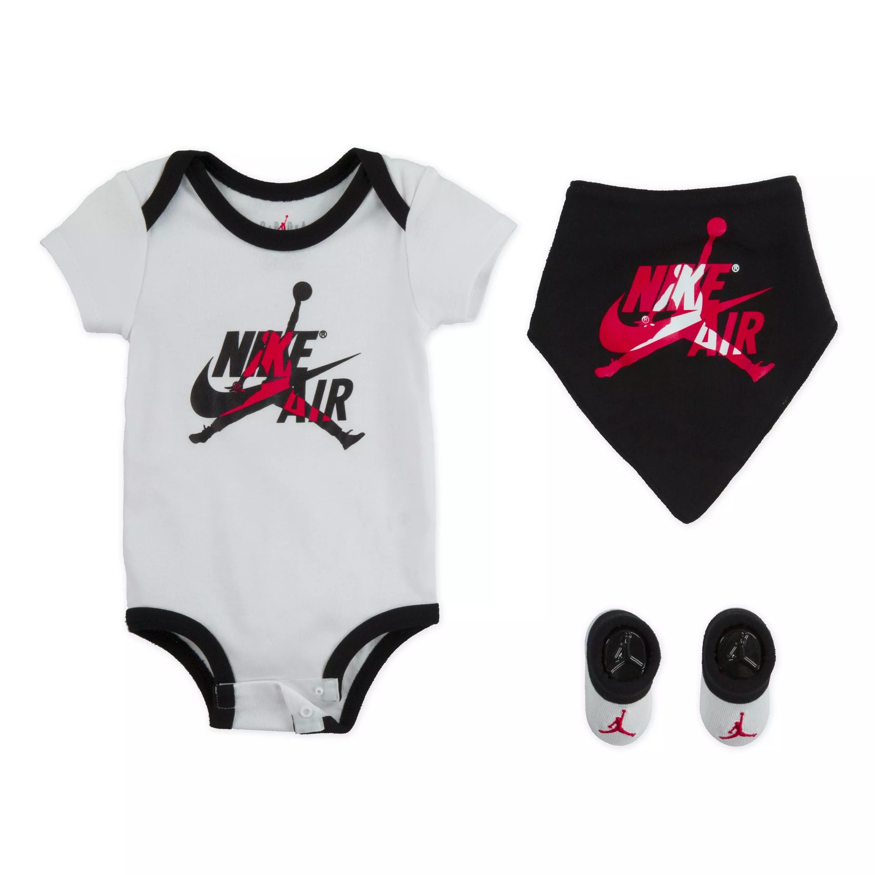 Start your tiny athlete with a lesson in the classics. The Jordan Jumpman Air Set for infants includes a short sleeve bodysuit with matching booties and a stylish bandana bib for a custom fit.
