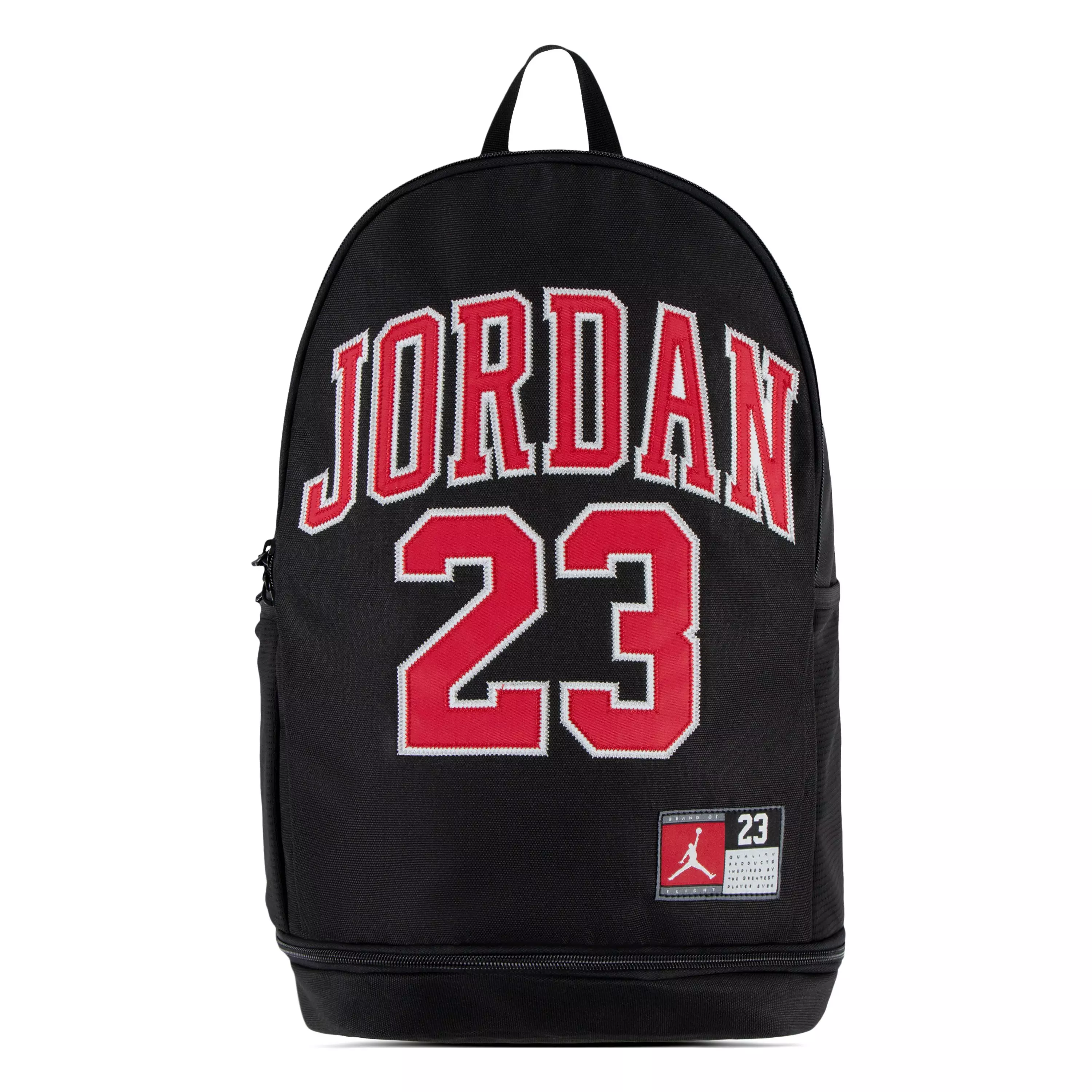 Jordan Jersey BackpackFeaturing a graphic inspired by the jerseys Michael Jordan wore, this Jordan Jersey Backpack has a versatile design that you can take from the school to the gym, basketball court or anywhere else you have to bring your haul. The zippered main compartment is nice and spacious, and houses a padded laptop sleeve. There is a large zippered pocket in the front that reveals an organizer that has multiple spaces for your pens, pencils, phone, notepad: anything you need quick access to. Side bottle pockets help you keep up with hydration goals, a padded back and adjustable straps create comfortable wear and there is a shoe garage with a zip closure at the bottom of the backpack that you can use to keep your gym shoes away from the items in the main space (like your laptop) that you don't want sullied.