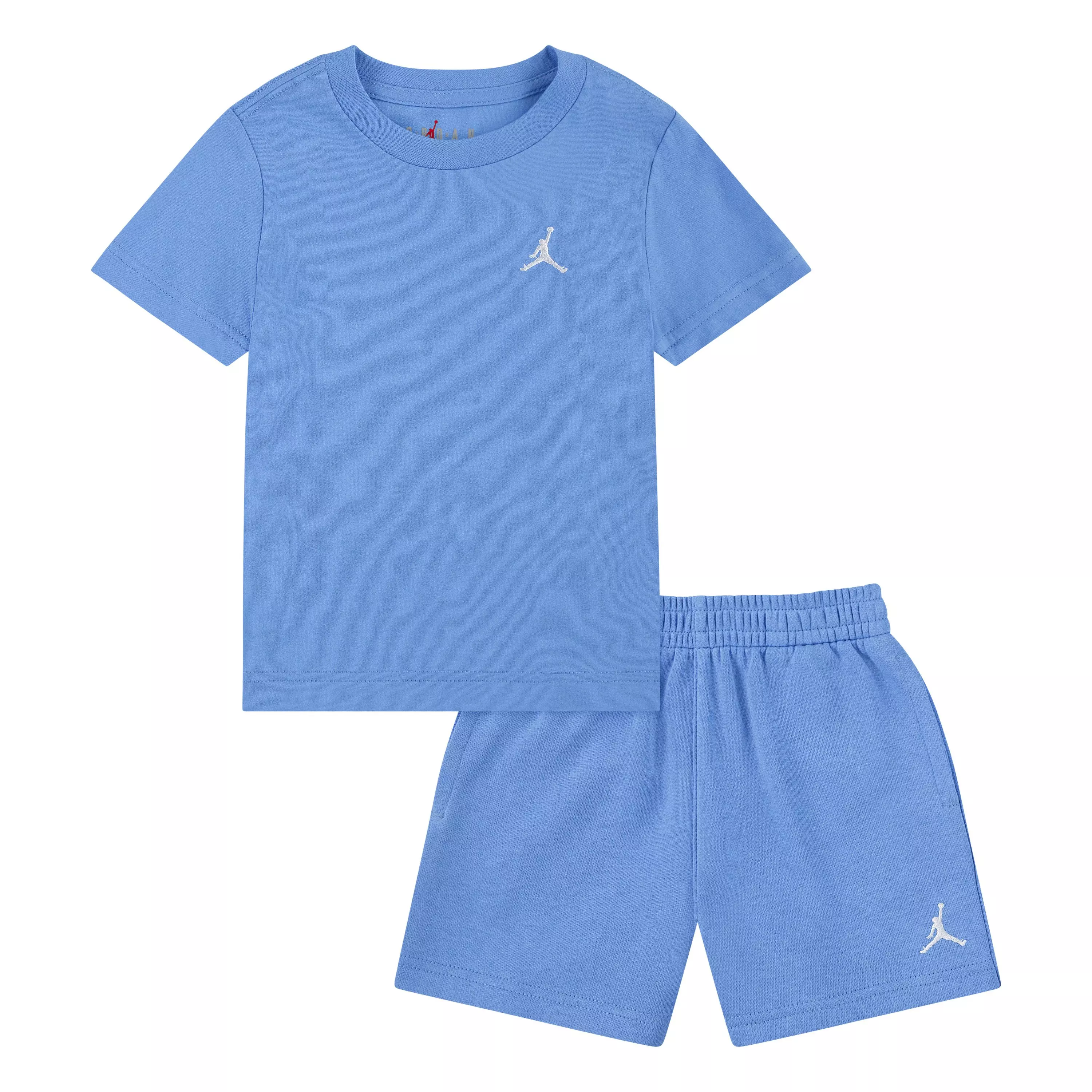 The Jordan Little Boys' Brooklyn Essential Fleece Short Set - University Blue pairs a cotton/poly jersey tee with tagless crewneck and smooth fleece shorts. The tee's timeless silhouette offers soft comfort and easy on-and-off. The shorts feature a stretch waistband and a plush interior lining that feels gentle on skin.