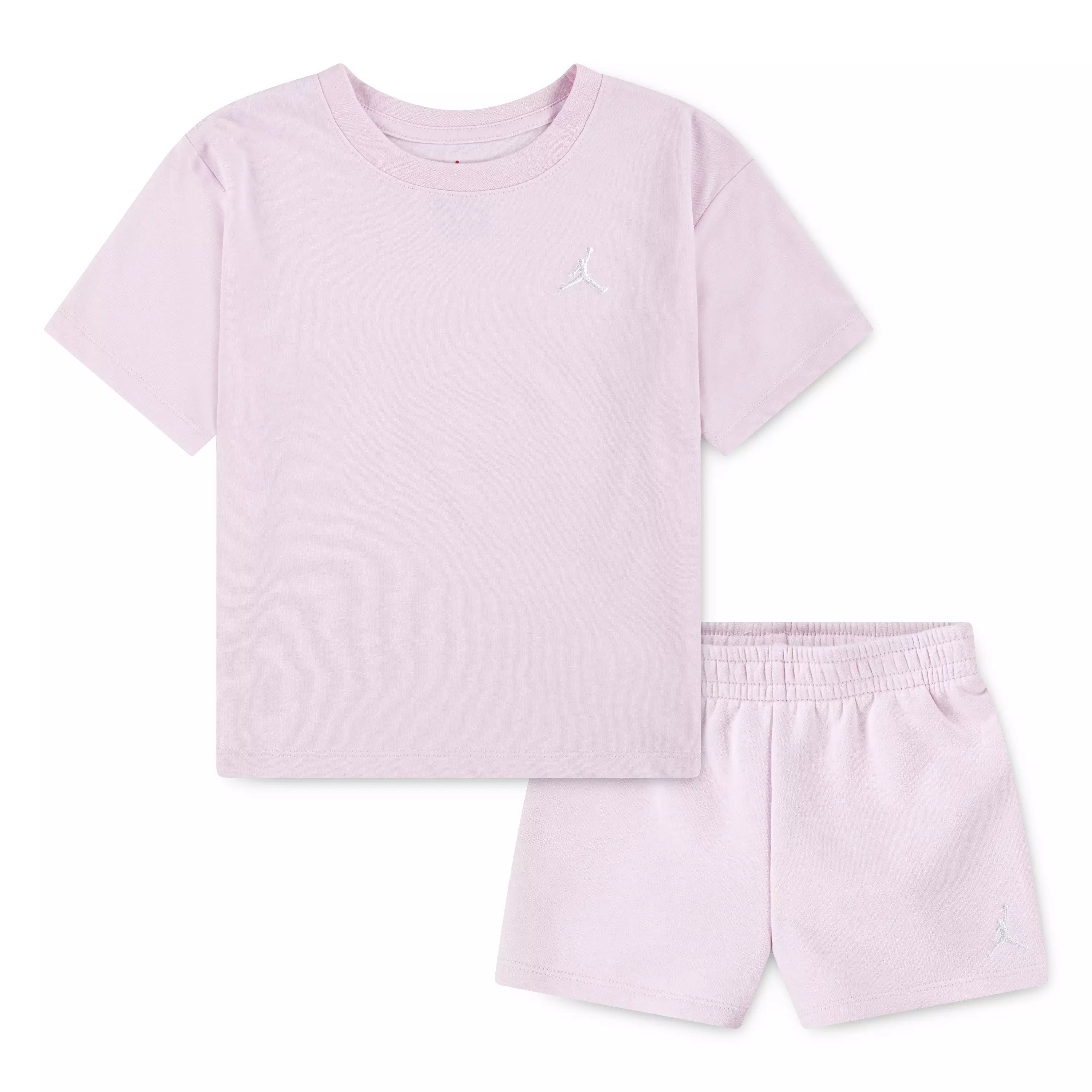 The Jordan Little Girls' Brooklyn Essential 2-Piece Set - Pink Foam pairs a soft tee made of stretch poly jersey with a tagless crewneck that enhances mobility and delivers lasting comfort. The crewneck design eliminates irritation against delicate skin.