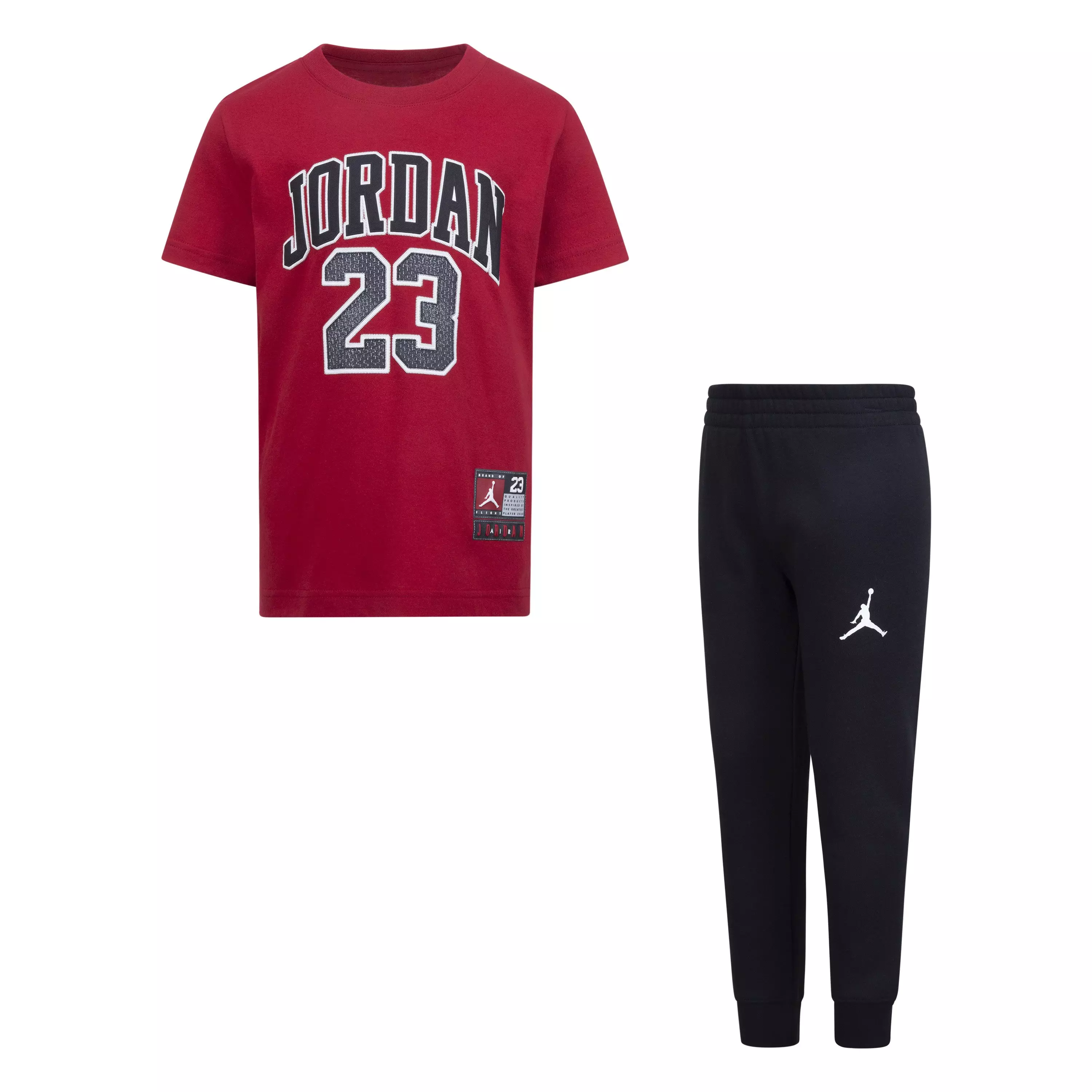 The Jordan Little Kids' Jogger Set - Red/Black pairs a smooth jersey knit tee with soft French terry shorts for all-day play. A tagless crewneck adds comfort, while the stretch waistband on the shorts ensures a secure, flexible fit during every run, skip, and jump.