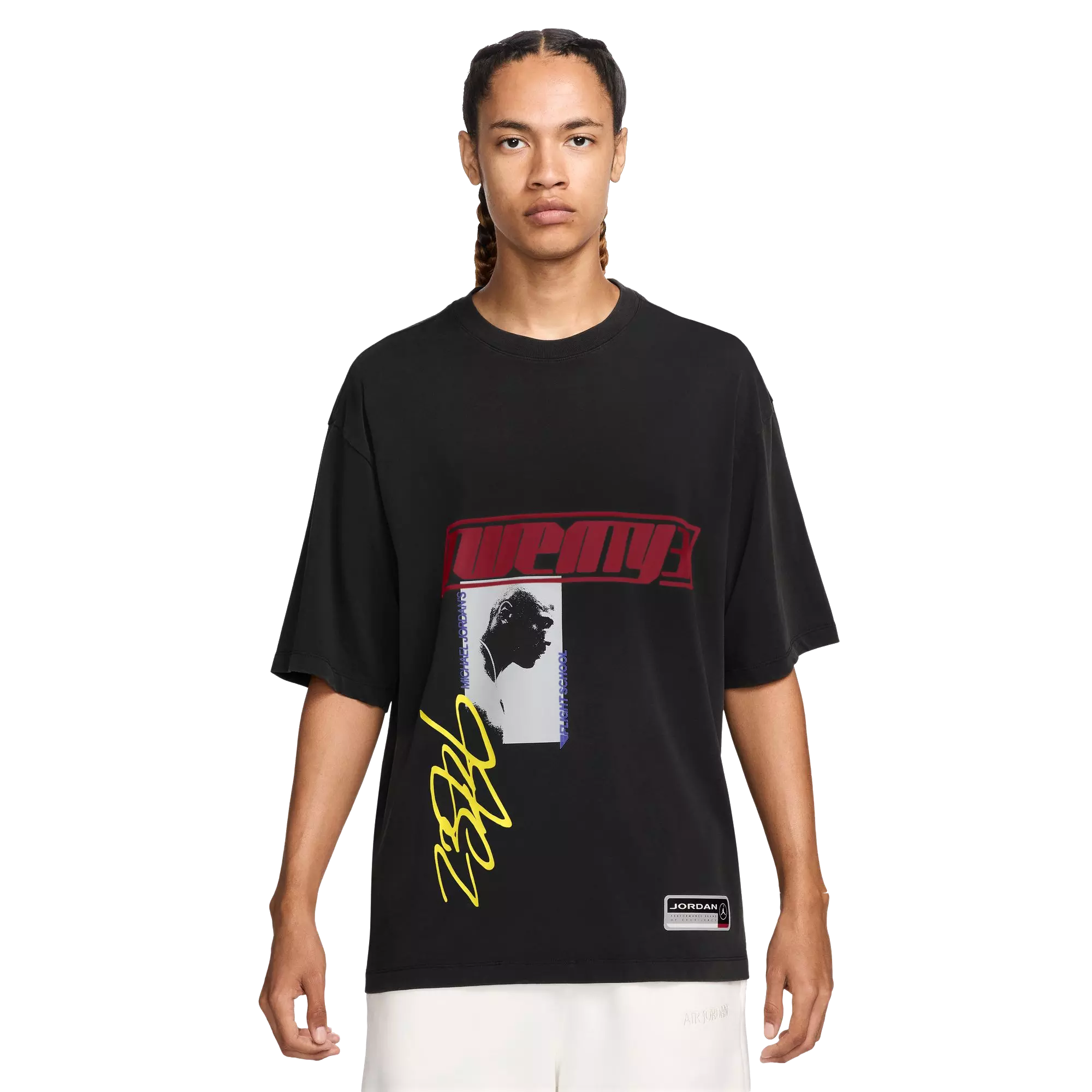 Jordan Men's Flight Essentials Tee features an oversized cut and an all-over wash that delivers a worn-in look. Distinct Flight Essentials graphics add a clean contrast across the chest. A drop-shoulder design enhances its relaxed profile.