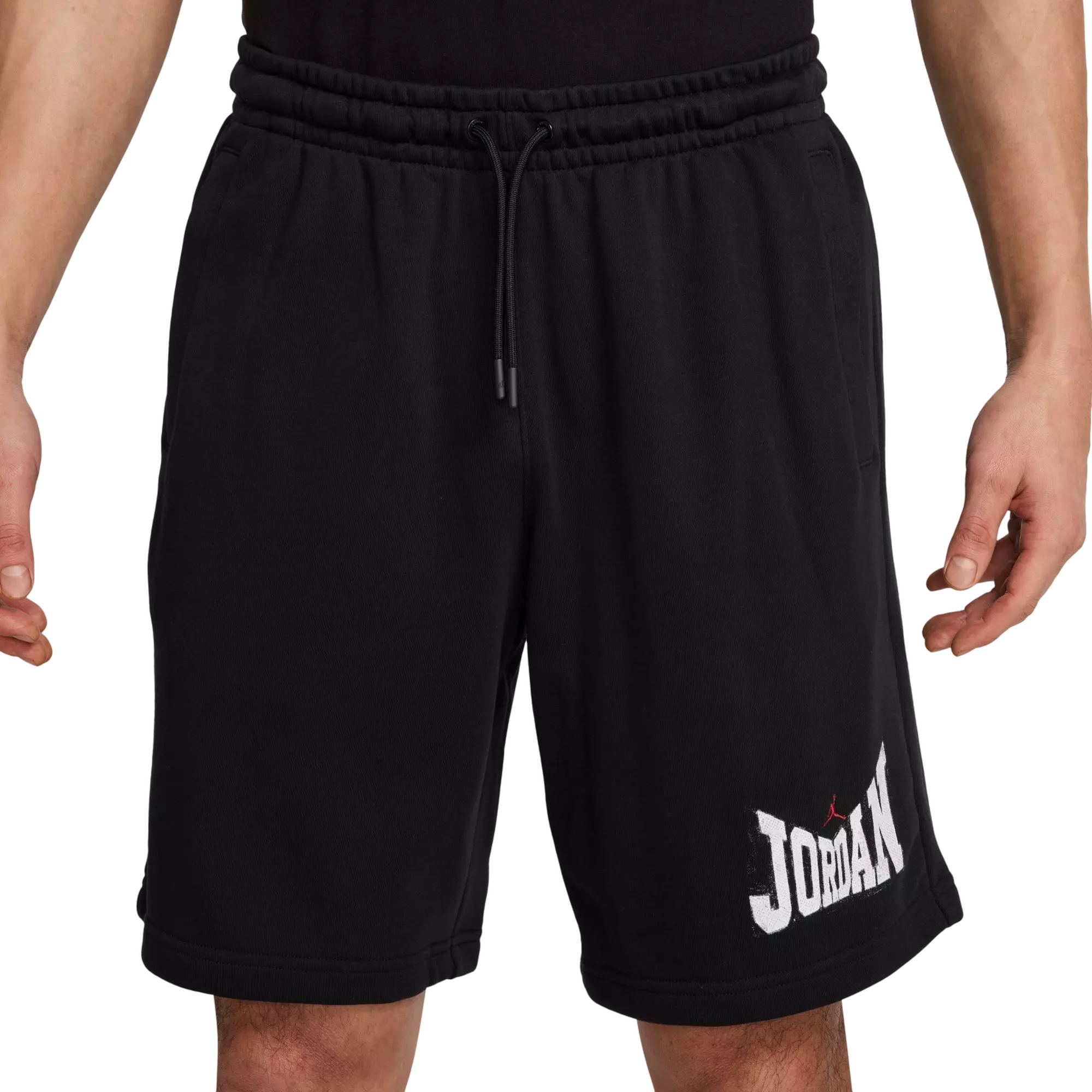 Elevate casual style with the Jordan Men's Wordmark Graphic 9-Inch Shorts - Black. The smooth exterior resists abrasion, while the unbrushed interior loops provide a soft feel against the skin for everyday comfort. Built for regular use, these shorts balance durability with a lightweight, easy-to-wear design.