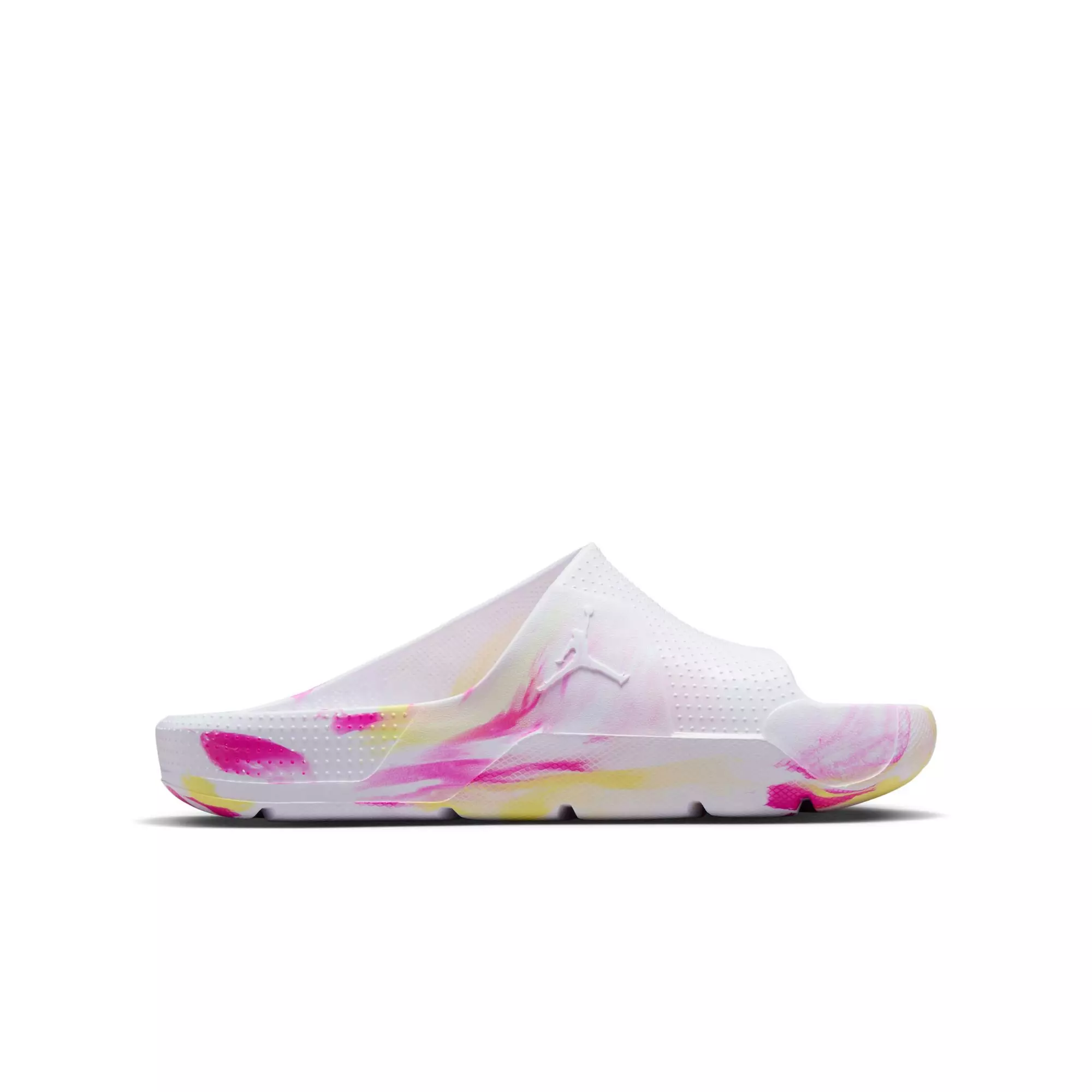 These Jordan Post "White/Lt Laser Orange/Laser Fuchsia" Grade School Girls' Slide feature robust, flexible foam and a wide foot covering that secures the foot. The asymmetrical design adds a distinct look while the lightweight sole cushions every step.