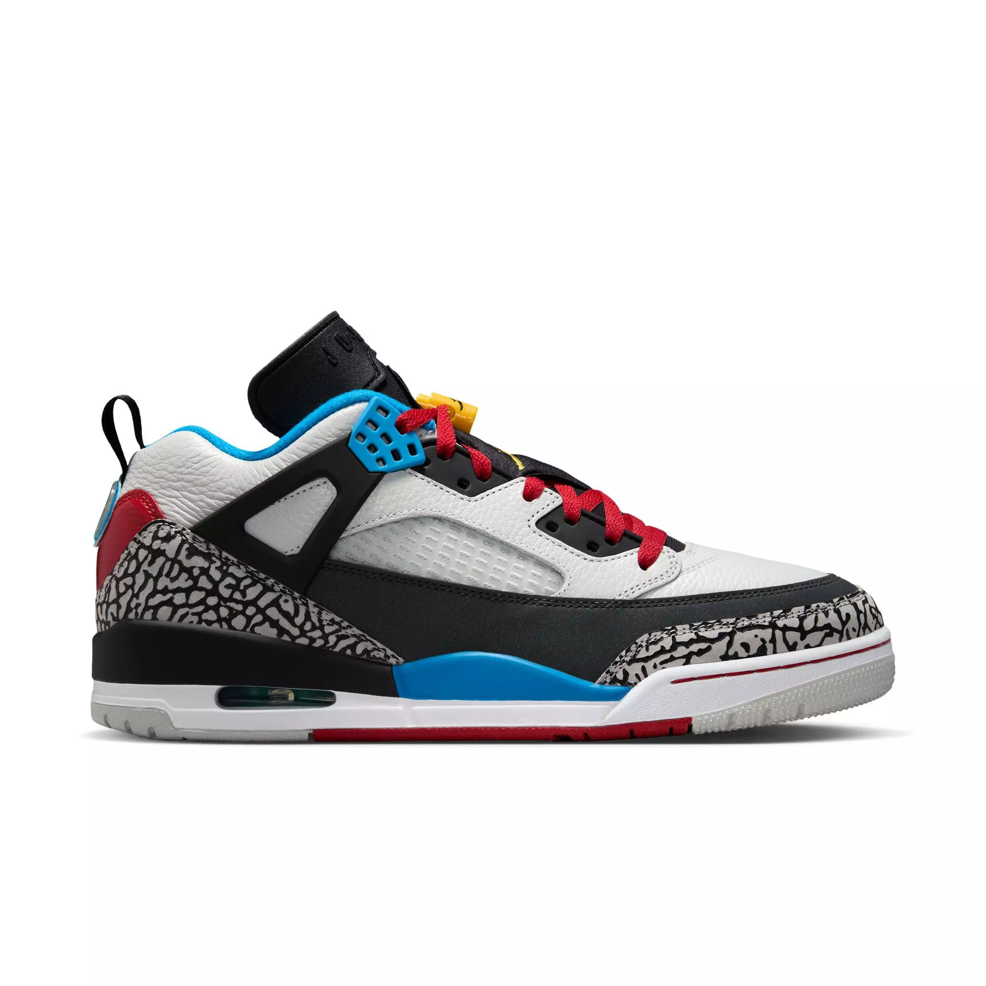 The Jordan Spizike Low SE "Neutral Grey/Varsity Maize/Surf Blue" Men's Shoe merges design cues from five classic Jordan models and pays homage to Spike Lee's role in merging Hollywood and hoops.