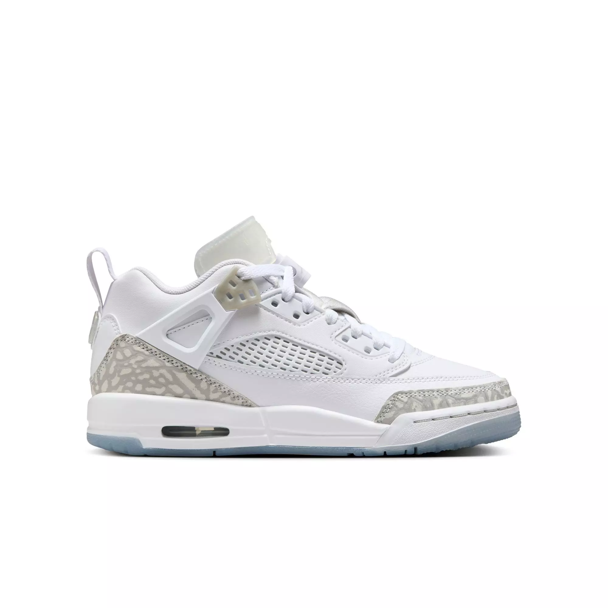 The Jordan Spizike Low 'White/Neutral Grey/Metallic Silver' Grade School Boys' Shoe blends elements of five classic Jordans into one iconic silhouette. This design honours Spike Lee's role in merging film and basketball culture.
