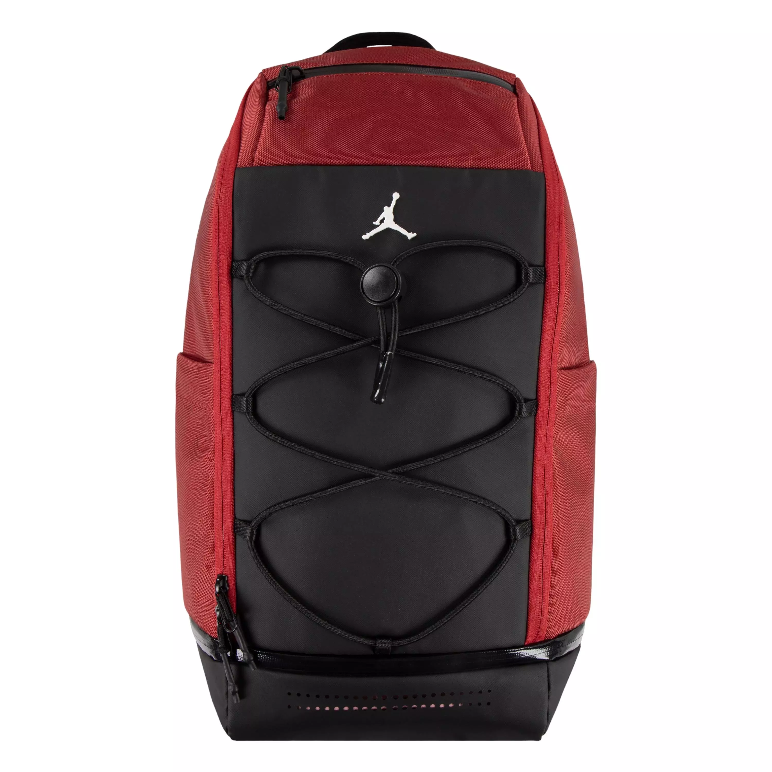 Carry your stuff in DNA style with this spacious Jordan Sport Backpack-Red. The spacious main zippered compartment can hold books, a change of clothes or whatever else you need. The zippered compartment on the back is padded to help secure a laptop or tablet. Keep up with hydration by using the side bottle pockets, the laced bungee cord on the front can be used to hold something extra and the adjustable padded straps provide comfortable wear. What really puts this backpack over the top are the organizational pockets and the ventilated shoe garage at the bottom!Features