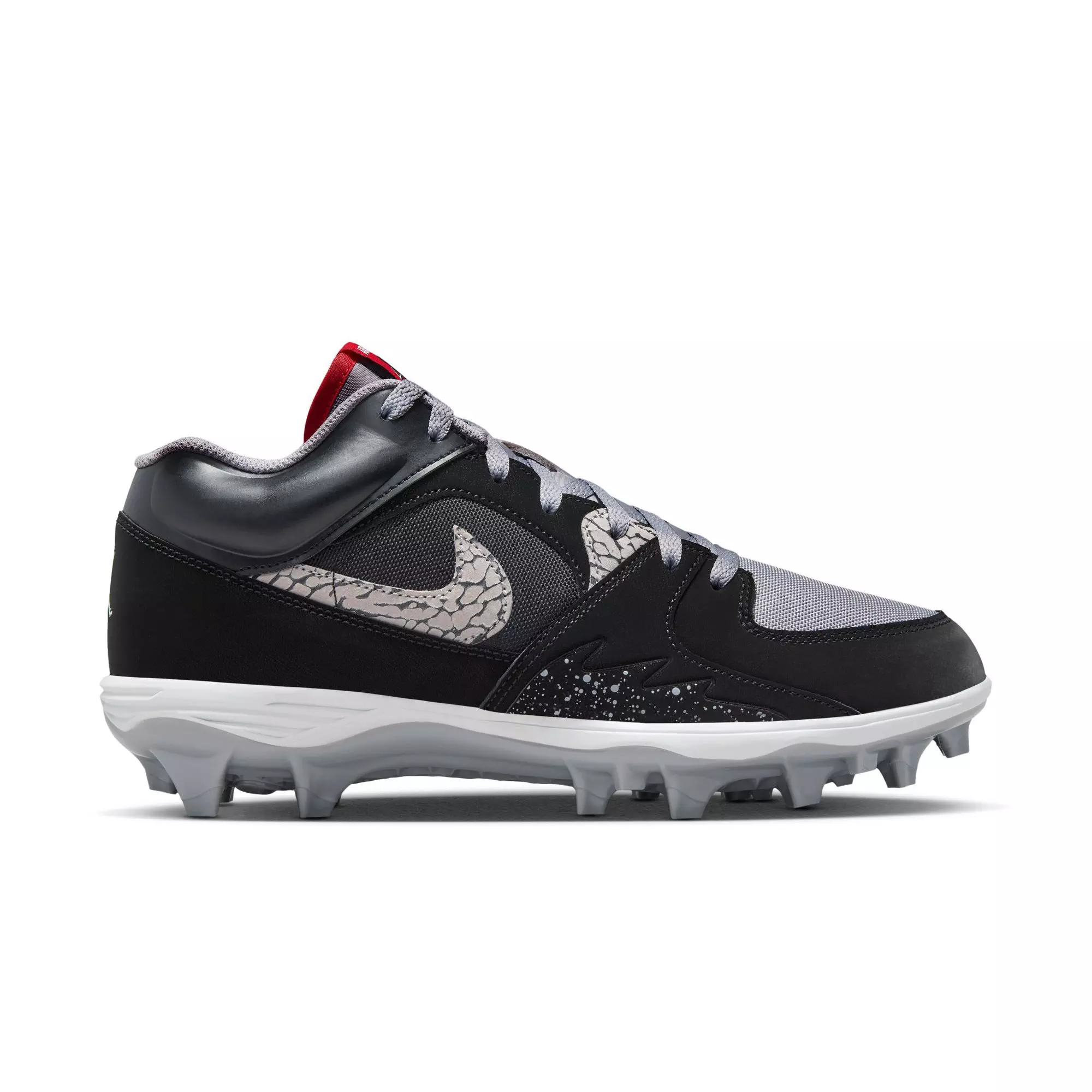 Built for explosive cuts and all-game comfort, the Jordan Stadium 90 Low TD "Black/Fire Red/Cement Grey/White" Men’s Football Cleat pairs a durable synthetic-leather upper with responsive cushioning to keep you quick on your feet. Wide stud placement and external traction pods help you plant, pivot, and accelerate with control on the field.