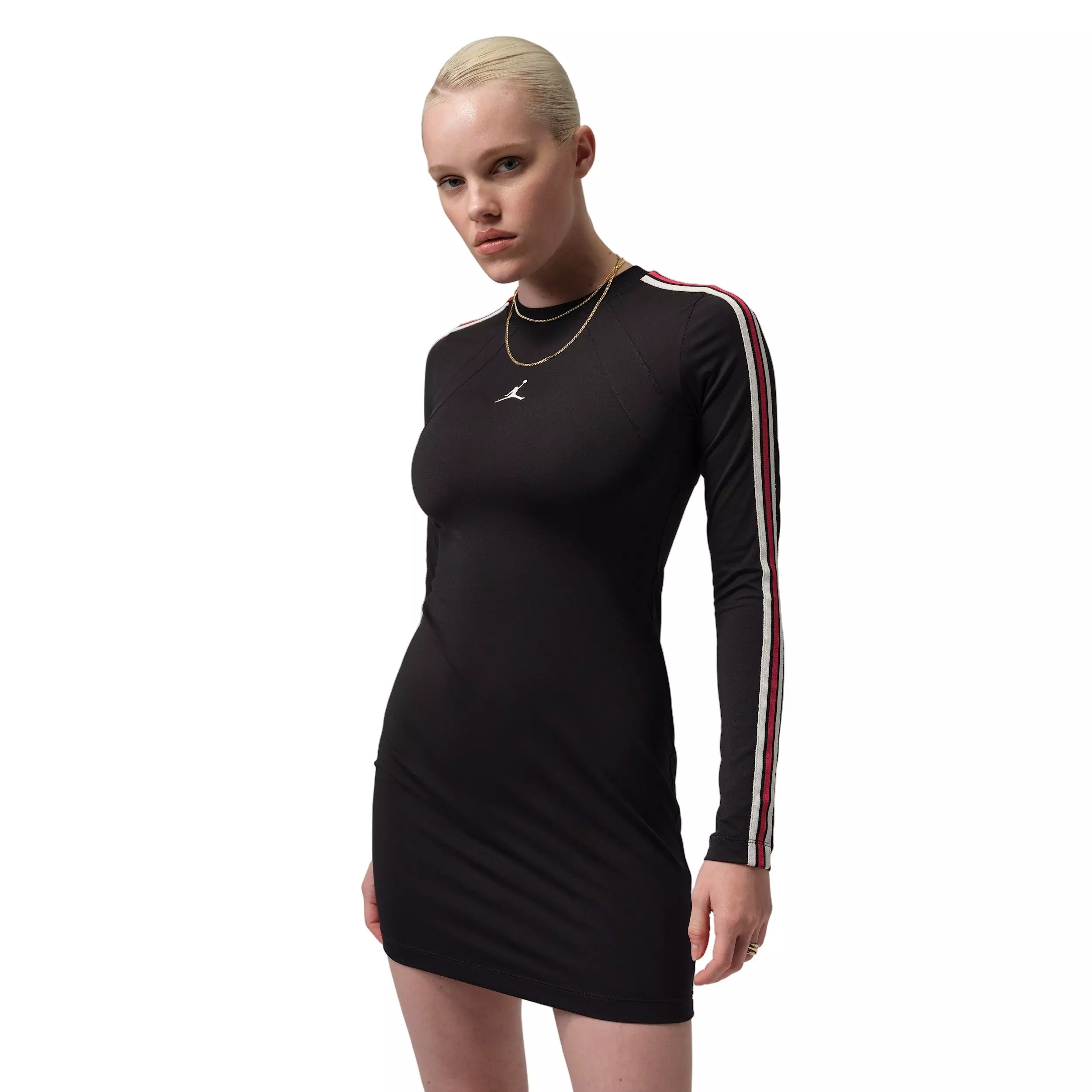This tight-fitting, mid-thigh length black Jordan Women's Brooklyn Long-Sleeve Dress could be your new staple. Jordan heritage—Wings lines and that embroidered Jumpman—combine with striped taping for a pared down look with just enough goin' on.
