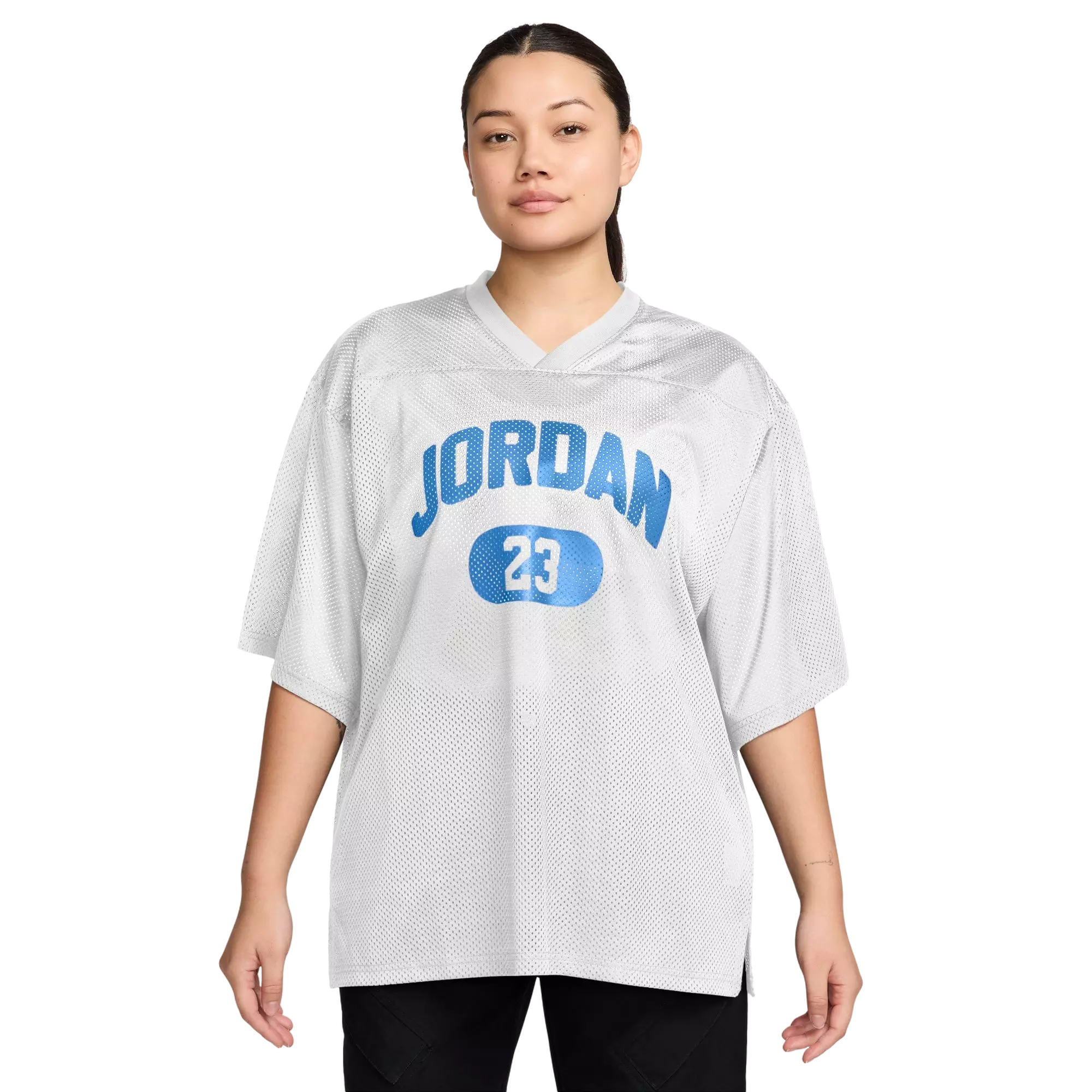 Comfortable and cool, this oversized, breathable mesh Jordan Women's Brooklyn Mesh Jersey Top gets it. Screenprinted graphics, embroidered Jumpman and ribbed neckline give you that classic jersey look.