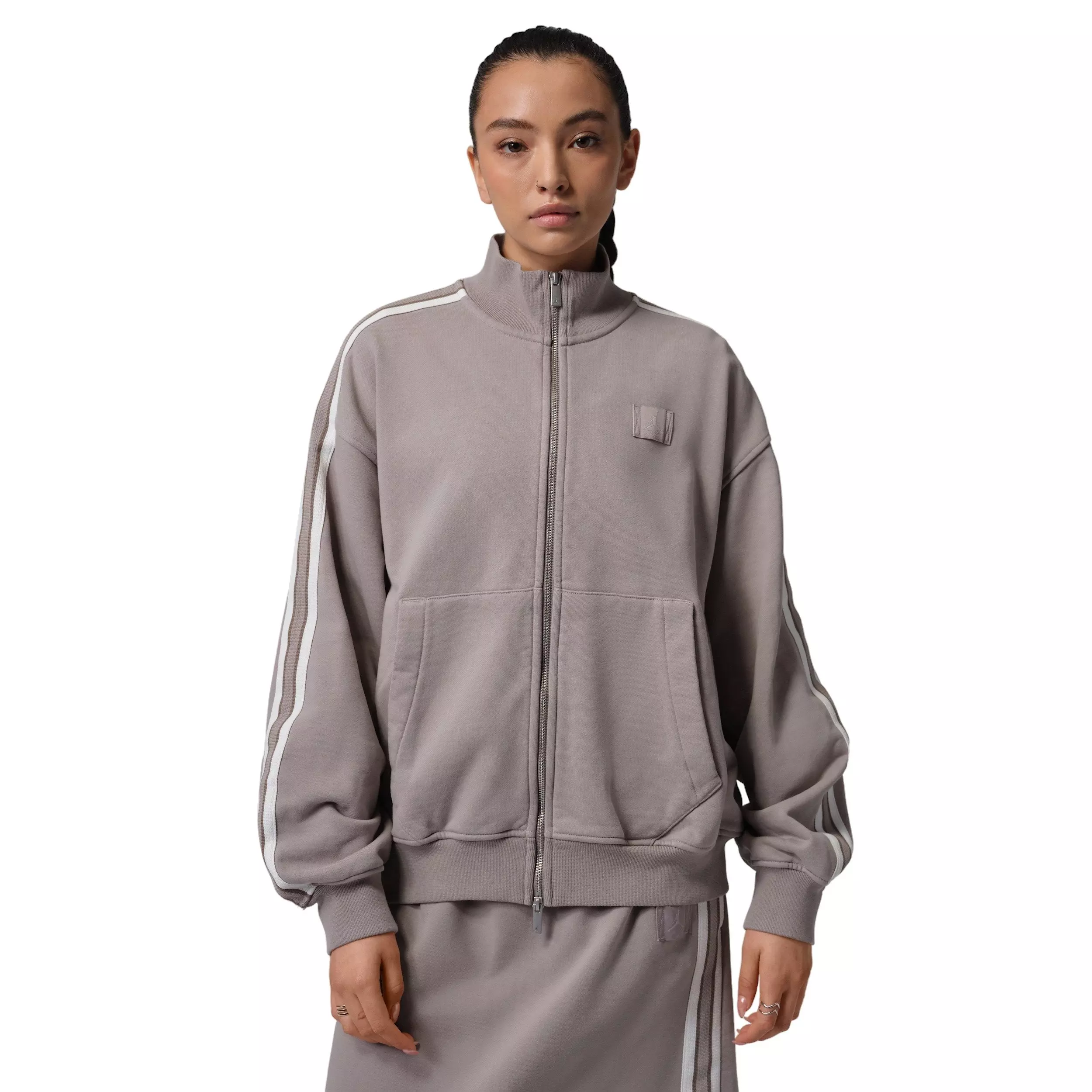 This stone Jordan Women's Flight Fleece French Terry Full-Zip Jacket is styled with that unbeatable French terry comfort. An all-over wash and sport taping give you that vintage look while the oversized fit gets you modern styling.Features