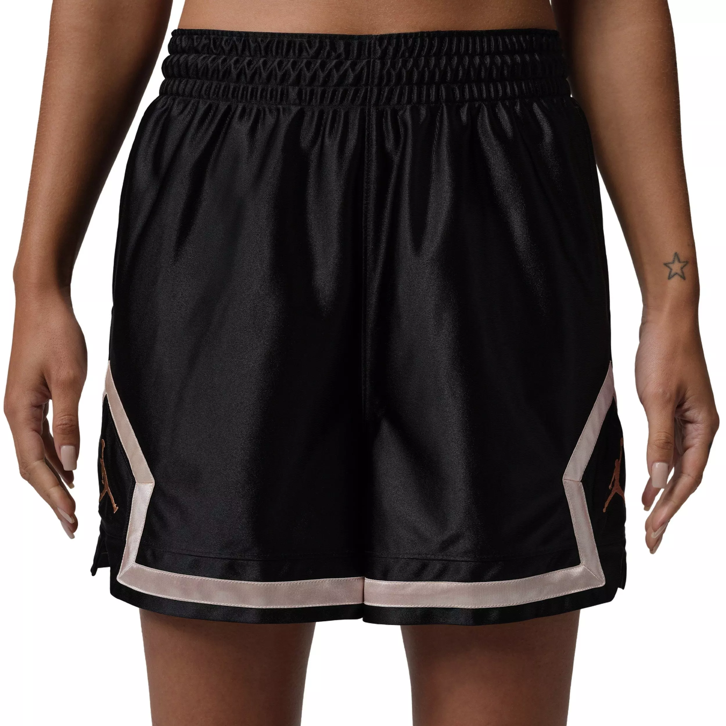 With our sweat-wicking tech and a 4" inseam, these Jordan Women's Sport Dri-FIT 4" Diamond Shorts - Black/Gold get it right. They're made with a shiny knit fabric that brings a soft sheen to your look. Our signature diamond taping keeps them rooted in heritage Jordan style.