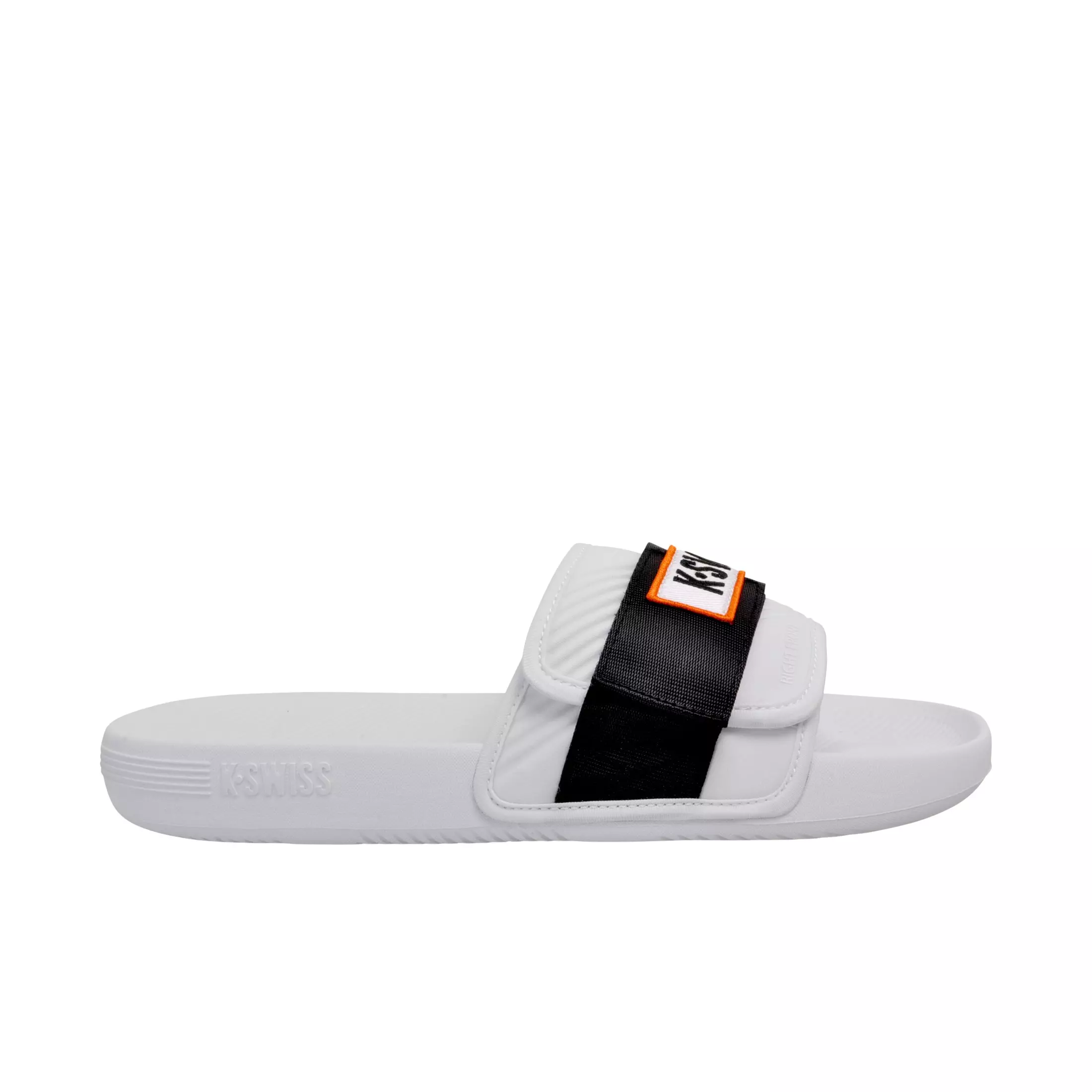 K-Swiss X McLaren "White/Black/Papaya" Men's Strap Sandal SlideEngineered for all-day comfort, this classically styled and easy to wear K-Swiss X McLaren "White/Black/Papaya" Men's Strap Sandal Slide inspired by race harness delivers a soft and lightweight EVA footbed for a cushioned ride. The linear McLaren graphics on the footbed provide anti-slip grip and help expel water.