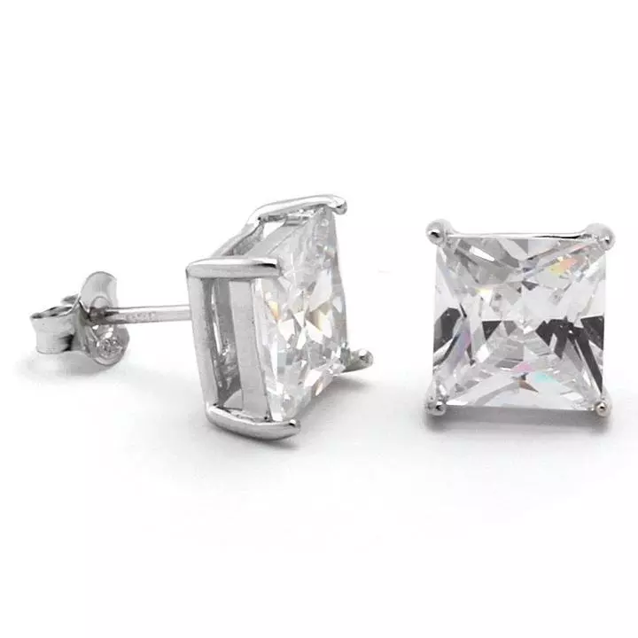 The King Ice White Gold Princess Stud 6mm Earrings feature .925 sterling silver casting studs plated in white gold. Each earring holds a 6mm princess-cut VVS diamond-simulate stone in a four-prong setting.