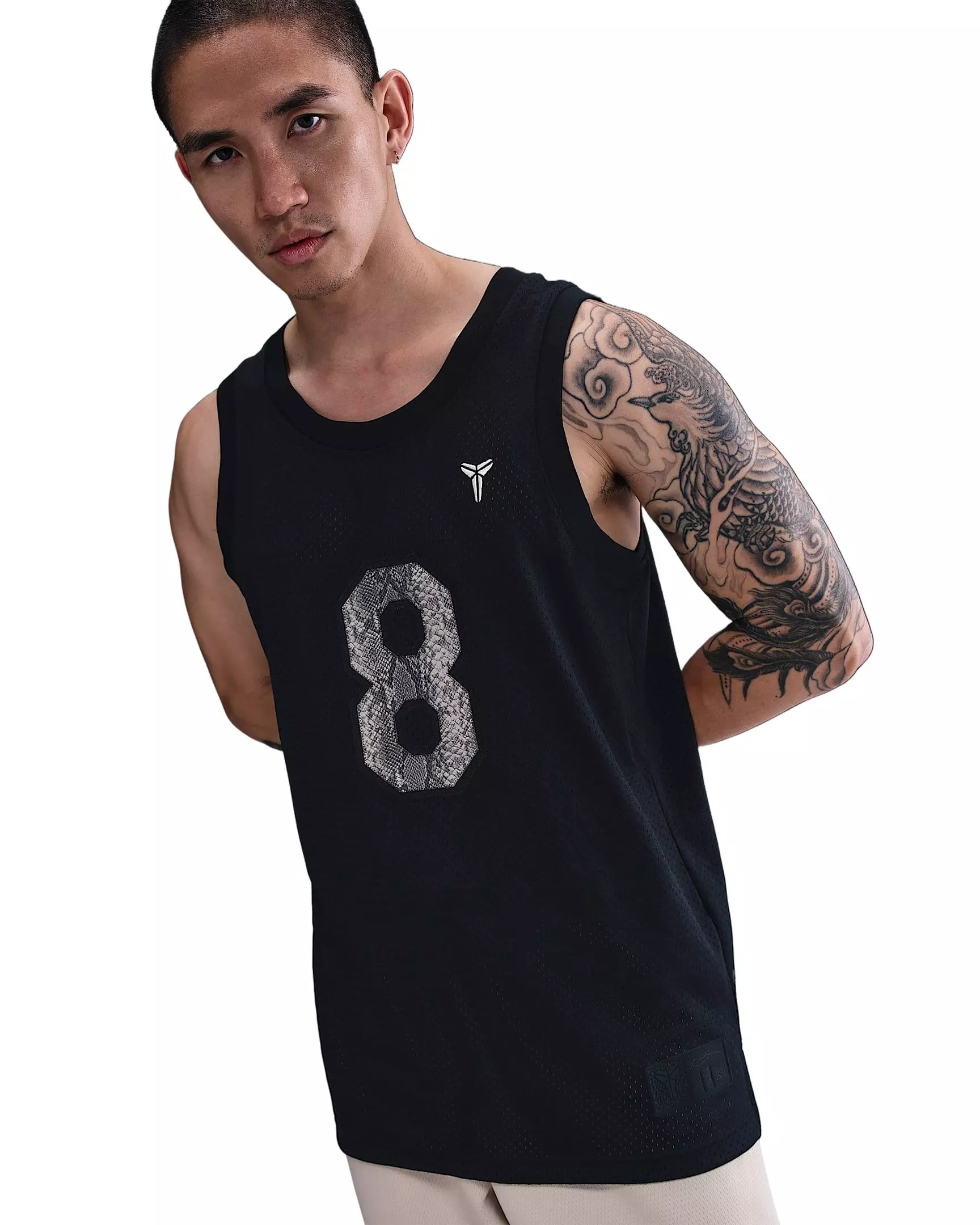 Two numbers, one mentality. Rep the Mamba’s journey with snakeskin-print numbers on this lightweight and breathable mesh black Kobe Men's Basketball Jersey.Features
