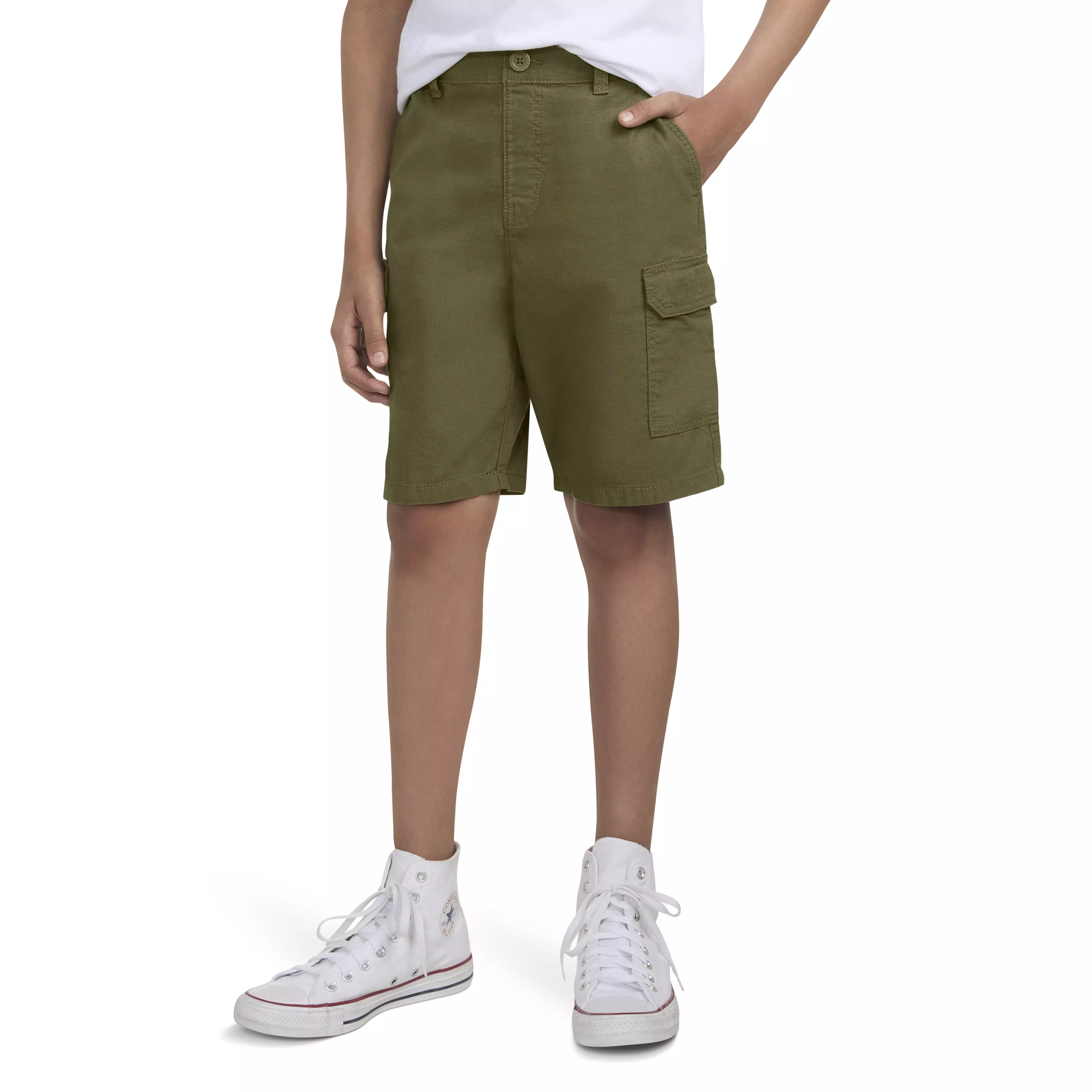 These olive green Levi's Big Boys' Cotton Cargo Shorts are made of cotton twill with a little added stretch. The pull-on design with an inner adjustable waistband helps kids get a comfy fit and six pockets give them plenty of space for their essential gear. And, the iconic Levi's Two-Horse Patch and Red Tab say everything that needs saying.Features