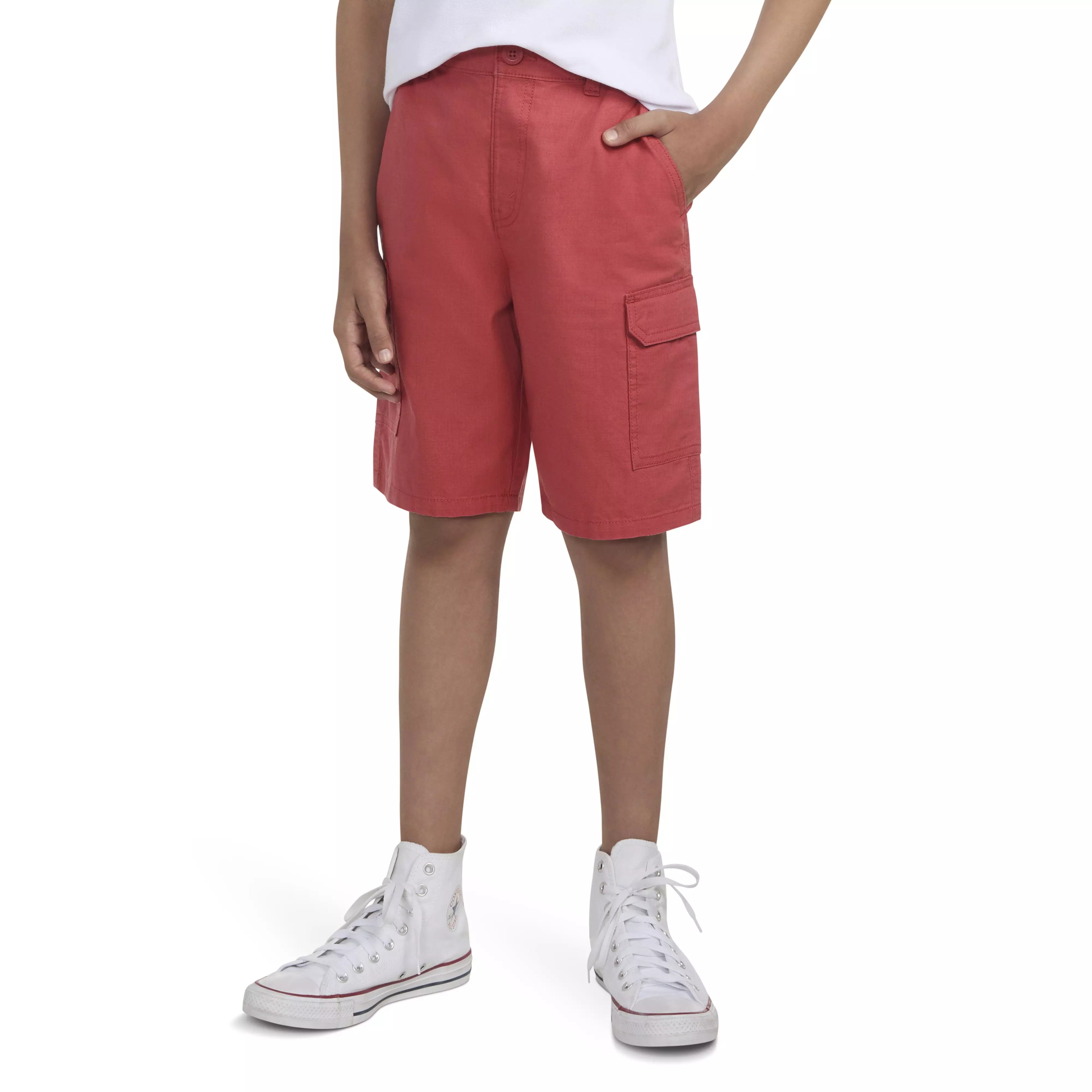 These red Levi's Big Boys' Cotton Cargo Shorts are made of cotton twill with a little added stretch. The pull-on design with an inner adjustable waistband helps kids get a comfy fit and six pockets give them plenty of space for their essential gear. And, the iconic Levi's Two-Horse Patch and Red Tab say everything that needs saying.Features