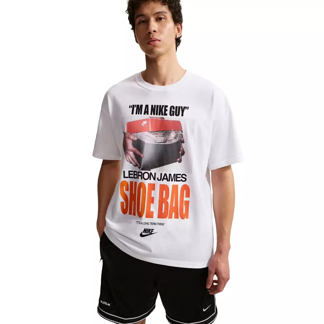 The bidding war for LeBron’s shoe services was expectedly heated and heralded. Ultimately, however, King James aligned with the brand that is home to the world’s greatest athletes and sports innovation. “I’m a Nike guy,” said LeBron. This Nike LeBron "Shoe Bag" Men's Basketball T-Shirt celebrates that groundbreaking signing, one that led to the longest-running and most successful franchises in history, a partnership that set the stage for future Chosen athletes.Features