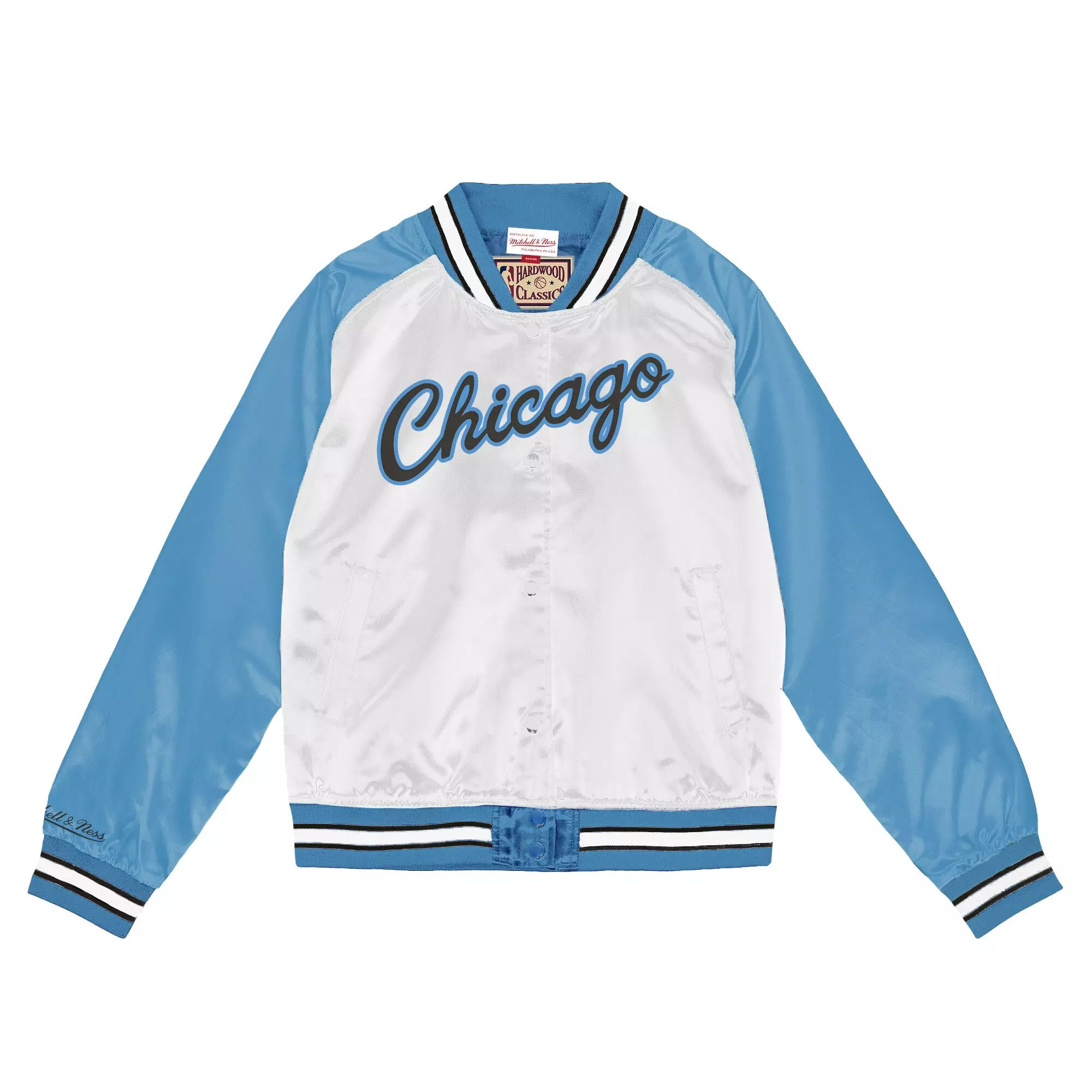 Need to rep the Bulls on a chilly night? Don't compromise the look with this Mitchell & Ness Men's Chicago Bulls NBA AJ Retro 11 "Carolina Blue" Satin Jacket-White/Light Blue. With its glossy finish and contrasting ribbed details, this jacket is perfect for chilly game days or casual outings where you want to showcase your Bulls pride in sophisticated fashion. Grab yours today!Features