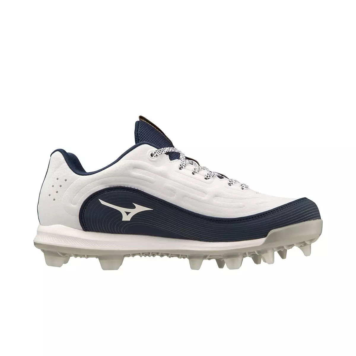 The 9-Spike Mizuno Advanced Finch Elite 6 TPU "White/Navy" Women's Softball Cleat is Gender Engineered for softball-specific movements. Translucent I-Shaped TPU studs provide a unique accent that also increases traction on multiple surfaces. The ribbed construction of the Mizuno C-Flex Outsole is a combination of enhanced stability, flexibility, and traction, while also reducing stud pressure to provide superior comfort during long games. The new 2 layered insole provides maximum step in comfort.Features